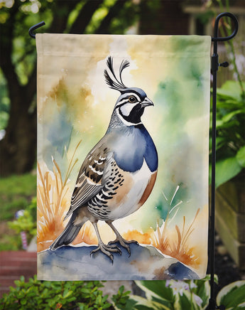 Garden Flag featuring breed specific California Quail artwork. Enhance the beauty of your garden, patio, or yard with Caroline's Treasures Decorative Garden Flag, proudly made in the USA. Crafted from two pieces of thick, double-sided polyester fabric, this 2-ply garden flag is designed to withstand various weather conditions, making it water-resistant and weatherproof. Featuring correctly readable words on both sides, this garden flag offers a delightful visual experience from any angle. With its heavier weight, it stands out among other garden flags, ensuring stability and durability even in wind, rain, and snow. Measuring approximately 11 1/4 inches by 15 1/2 inches, this flag allows you to personalize your outdoor decor. It comes with a 1 1/2-inch sleeve sewn in, allowing easy attachment to any standard garden flag stand or garden size porch hanger (sold separately). Make a statement in your outdoor space with Caroline's Treasures Decorative Garden Flag, a vibrant and high-quality flag that adds color and personality to your surroundings. Proudly made in the USA, it's a symbol of quality craftsmanship and attention to detail.