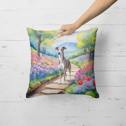 Decorate your space with Caroline's Treasures Whippet artwork on a Pillow. Bring a bit of Spring into your home with a Spring Pillow. Revitalize your outdoor or indoor living space with Caroline's Treasures 18x18 Fabric Decorative Pillow. With a generously sized dimension of approximately 18 inches by 18 inches, this pillow makes a comfortable and aesthetic addition to any seating area. Made from a unique, water-resistant material developed by Caroline's Treasures, the pillow sham is 100% polyester fabric that's durable and ready to weather any condition. Its vibrant, full-color artwork will not fade over time as it is dyed with color-fast dyes. Whether you place it on your patio furniture, porch, veranda, or indoor couch, its soft canvas fabric ensures a cozy experience. The pillow is handcrafted in the United States, featuring a sham created from three pieces of fabric and a polyester insert for enduring shape and overstuffed comfort. Despite being robustly built to endure the outdoors, it is as soft and snug as your favorite indoor cushions. Please note, as all Caroline's Treasures pillows are handmade, sizes may vary slightly, adding to the charm of this unique decorative item.
