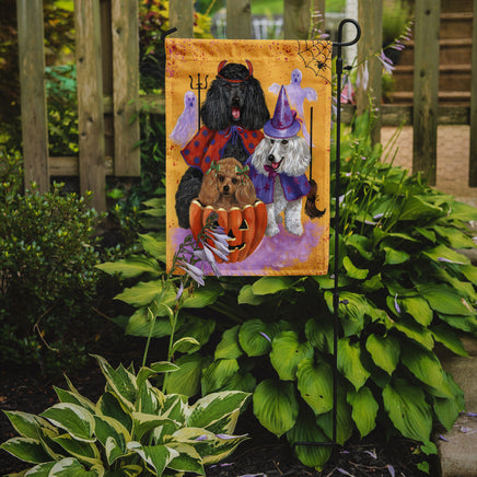 Decorate your space with our Halloween Poodle artwork on a Garden Flag. Enhance the beauty of your garden, patio, or yard with Caroline's Treasures Decorative Garden Flag, proudly made in the USA. Crafted from two pieces of thick, double-sided polyester fabric, this 2-ply garden flag is designed to withstand various weather conditions, making it water-resistant and weatherproof. Featuring correctly readable words on both sides, this garden flag offers a delightful visual experience from any angle. With its heavier weight, it stands out among other garden flags, ensuring stability and durability even in wind, rain, and snow. Measuring approximately 11 1/4 inches by 15 1/2 inches, this flag allows you to personalize your outdoor decor. It comes with a 1 1/2-inch sleeve sewn in, allowing easy attachment to any standard garden flag stand or garden size porch hanger (sold separately). Make a statement in your outdoor space with Caroline's Treasures Decorative Garden Flag, a vibrant and high-quality flag that adds color and personality to your surroundings. Proudly made in the USA, it's a symbol of quality craftsmanship and attention to detail.