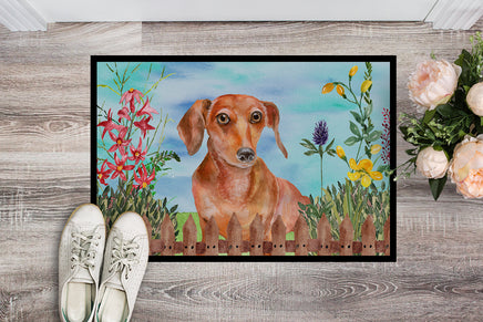 Decorate your space with Caroline's Treasures Dachshund artwork on a Doormat. Bring a bit of Spring into your home with a Spring Doormat. Welcome your guests in style with Caroline's Treasures Artwork Door Mat, designed to withstand almost any weather condition. This mat, measuring approximately 18 by 27 inches, is held together by durable black binding tape. Its top layer, composed of polyester felt, is dyed with the eye-catching image you see on the mat. A few layers below provide the mat with stability, while its rubber bottom is stamped to help prevent slipping and ensures safety. Caroline's Treasures mat works wonderfully as both an indoor or outdoor door mat. For cleaning, simply hose it off with water or use a power washer - no need for any cleaner that produces suds. Avoid scrubbing with a brush, instead, opt for the vacuum on floor setting. Designed manufactured and printed in the USA, this mat is a perfect addition to your porch, outdoor kitchen, entryway, or any indoor space. Its unique design makes it a charming decorative rug that greets your guests and adds a stylish touch to your home decor.