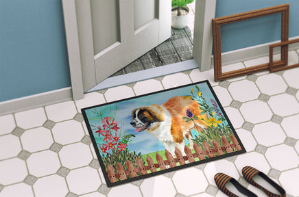 Decorate your space with Caroline's Treasures Saint Bernard artwork on a Doormat. Bring a bit of Spring into your home with a Spring Doormat. Welcome your guests in style with Caroline's Treasures Artwork Door Mat, designed to withstand almost any weather condition. This mat, measuring approximately 18 by 27 inches, is held together by durable black binding tape. Its top layer, composed of polyester felt, is dyed with the eye-catching image you see on the mat. A few layers below provide the mat with stability, while its rubber bottom is stamped to help prevent slipping and ensures safety. Caroline's Treasures mat works wonderfully as both an indoor or outdoor door mat. For cleaning, simply hose it off with water or use a power washer - no need for any cleaner that produces suds. Avoid scrubbing with a brush, instead, opt for the vacuum on floor setting. Designed manufactured and printed in the USA, this mat is a perfect addition to your porch, outdoor kitchen, entryway, or any indoor space. Its unique design makes it a charming decorative rug that greets your guests and adds a stylish touch to your home decor.