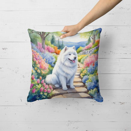 Decorate your space with Caroline's Treasures Samoyed artwork on a Pillow. Bring a bit of Spring into your home with a Spring Pillow. Revitalize your outdoor or indoor living space with Caroline's Treasures 18x18 Fabric Decorative Pillow. With a generously sized dimension of approximately 18 inches by 18 inches, this pillow makes a comfortable and aesthetic addition to any seating area. Made from a unique, water-resistant material developed by Caroline's Treasures, the pillow sham is 100% polyester fabric that's durable and ready to weather any condition. Its vibrant, full-color artwork will not fade over time as it is dyed with color-fast dyes. Whether you place it on your patio furniture, porch, veranda, or indoor couch, its soft canvas fabric ensures a cozy experience. The pillow is handcrafted in the United States, featuring a sham created from three pieces of fabric and a polyester insert for enduring shape and overstuffed comfort. Despite being robustly built to endure the outdoors, it is as soft and snug as your favorite indoor cushions. Please note, as all Caroline's Treasures pillows are handmade, sizes may vary slightly, adding to the charm of this unique decorative item.
