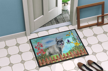 Decorate your space with Caroline's Treasures Schnauzer artwork on a Doormat. Bring a bit of Spring into your home with a Spring Doormat. Welcome your guests in style with Caroline's Treasures Artwork Door Mat, designed to withstand almost any weather condition. This mat, measuring approximately 18 by 27 inches, is held together by durable black binding tape. Its top layer, composed of polyester felt, is dyed with the eye-catching image you see on the mat. A few layers below provide the mat with stability, while its rubber bottom is stamped to help prevent slipping and ensures safety. Caroline's Treasures mat works wonderfully as both an indoor or outdoor door mat. For cleaning, simply hose it off with water or use a power washer - no need for any cleaner that produces suds. Avoid scrubbing with a brush, instead, opt for the vacuum on floor setting. Designed manufactured and printed in the USA, this mat is a perfect addition to your porch, outdoor kitchen, entryway, or any indoor space. Its unique design makes it a charming decorative rug that greets your guests and adds a stylish touch to your home decor.
