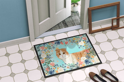 Decorate your space with Caroline's Treasures Scottish Fold artwork on a Doormat. Welcome your guests in style with Caroline's Treasures Artwork Door Mat, designed to withstand almost any weather condition. This mat, measuring approximately 18 by 27 inches, is held together by durable black binding tape. Its top layer, composed of polyester felt, is dyed with the eye-catching image you see on the mat. A few layers below provide the mat with stability, while its rubber bottom is stamped to help prevent slipping and ensures safety. Caroline's Treasures mat works wonderfully as both an indoor or outdoor door mat. For cleaning, simply hose it off with water or use a power washer - no need for any cleaner that produces suds. Avoid scrubbing with a brush, instead, opt for the vacuum on floor setting. Designed manufactured and printed in the USA, this mat is a perfect addition to your porch, outdoor kitchen, entryway, or any indoor space. Its unique design makes it a charming decorative rug that greets your guests and adds a stylish touch to your home decor.
