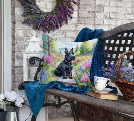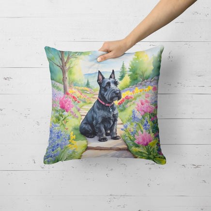 Decorate your space with Caroline's Treasures Scottish Terrier artwork on a Pillow. Bring a bit of Spring into your home with a Spring Pillow. Revitalize your outdoor or indoor living space with Caroline's Treasures 18x18 Fabric Decorative Pillow. With a generously sized dimension of approximately 18 inches by 18 inches, this pillow makes a comfortable and aesthetic addition to any seating area. Made from a unique, water-resistant material developed by Caroline's Treasures, the pillow sham is 100% polyester fabric that's durable and ready to weather any condition. Its vibrant, full-color artwork will not fade over time as it is dyed with color-fast dyes. Whether you place it on your patio furniture, porch, veranda, or indoor couch, its soft canvas fabric ensures a cozy experience. The pillow is handcrafted in the United States, featuring a sham created from three pieces of fabric and a polyester insert for enduring shape and overstuffed comfort. Despite being robustly built to endure the outdoors, it is as soft and snug as your favorite indoor cushions. Please note, as all Caroline's Treasures pillows are handmade, sizes may vary slightly, adding to the charm of this unique decorative item.