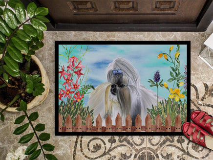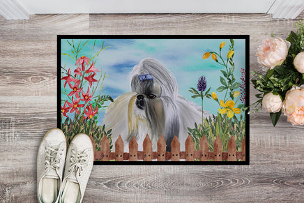 Decorate your space with Caroline's Treasures Shih Tzu artwork on a Doormat. Bring a bit of Spring into your home with a Spring Doormat. Welcome your guests in style with Caroline's Treasures Artwork Door Mat, designed to withstand almost any weather condition. This mat, measuring approximately 18 by 27 inches, is held together by durable black binding tape. Its top layer, composed of polyester felt, is dyed with the eye-catching image you see on the mat. A few layers below provide the mat with stability, while its rubber bottom is stamped to help prevent slipping and ensures safety. Caroline's Treasures mat works wonderfully as both an indoor or outdoor door mat. For cleaning, simply hose it off with water or use a power washer - no need for any cleaner that produces suds. Avoid scrubbing with a brush, instead, opt for the vacuum on floor setting. Designed manufactured and printed in the USA, this mat is a perfect addition to your porch, outdoor kitchen, entryway, or any indoor space. Its unique design makes it a charming decorative rug that greets your guests and adds a stylish touch to your home decor.