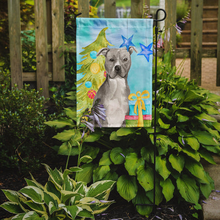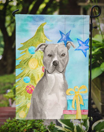 Decorate your space with Caroline's Treasures Christmas Staffordshire Bull Terrier artwork on a Garden Flag. Enhance the beauty of your garden, patio, or yard with Caroline's Treasures Decorative Garden Flag, proudly made in the USA. Crafted from two pieces of thick, double-sided polyester fabric, this 2-ply garden flag is designed to withstand various weather conditions, making it water-resistant and weatherproof. Featuring correctly readable words on both sides, this garden flag offers a delightful visual experience from any angle. With its heavier weight, it stands out among other garden flags, ensuring stability and durability even in wind, rain, and snow. Measuring approximately 11 1/4 inches by 15 1/2 inches, this flag allows you to personalize your outdoor decor. It comes with a 1 1/2-inch sleeve sewn in, allowing easy attachment to any standard garden flag stand or garden size porch hanger (sold separately). Make a statement in your outdoor space with Caroline's Treasures Decorative Garden Flag, a vibrant and high-quality flag that adds color and personality to your surroundings. Proudly made in the USA, it's a symbol of quality craftsmanship and attention to detail.