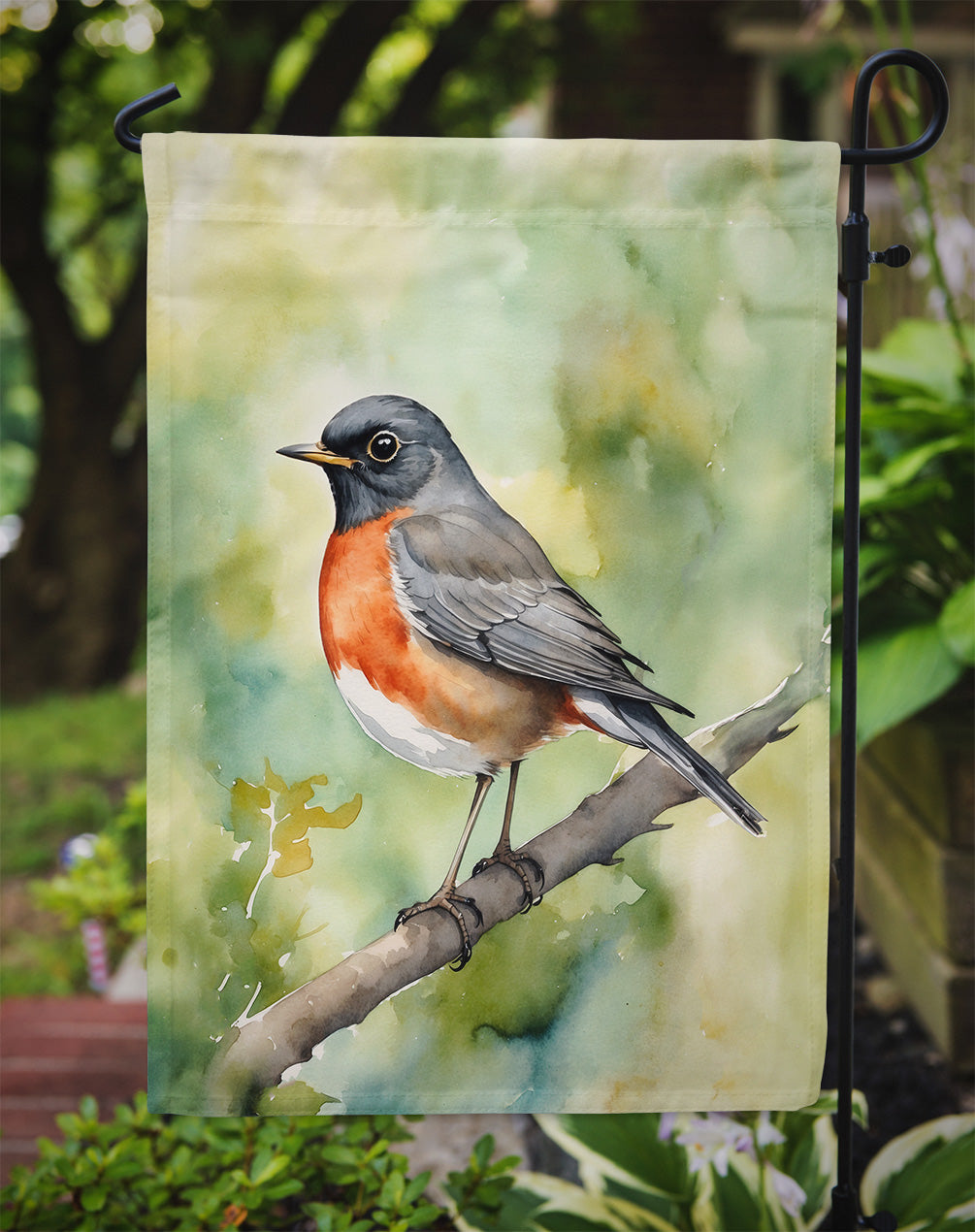 Garden Flag featuring breed specific American Robin artwork. Enhance the beauty of your garden, patio, or yard with Caroline's Treasures Decorative Garden Flag, proudly made in the USA. Crafted from two pieces of thick, double-sided polyester fabric, this 2-ply garden flag is designed to withstand various weather conditions, making it water-resistant and weatherproof. Featuring correctly readable words on both sides, this garden flag offers a delightful visual experience from any angle. With its heavier weight, it stands out among other garden flags, ensuring stability and durability even in wind, rain, and snow. Measuring approximately 11 1/4 inches by 15 1/2 inches, this flag allows you to personalize your outdoor decor. It comes with a 1 1/2-inch sleeve sewn in, allowing easy attachment to any standard garden flag stand or garden size porch hanger (sold separately). Make a statement in your outdoor space with Caroline's Treasures Decorative Garden Flag, a vibrant and high-quality flag that adds color and personality to your surroundings. Proudly made in the USA, it's a symbol of quality craftsmanship and attention to detail.