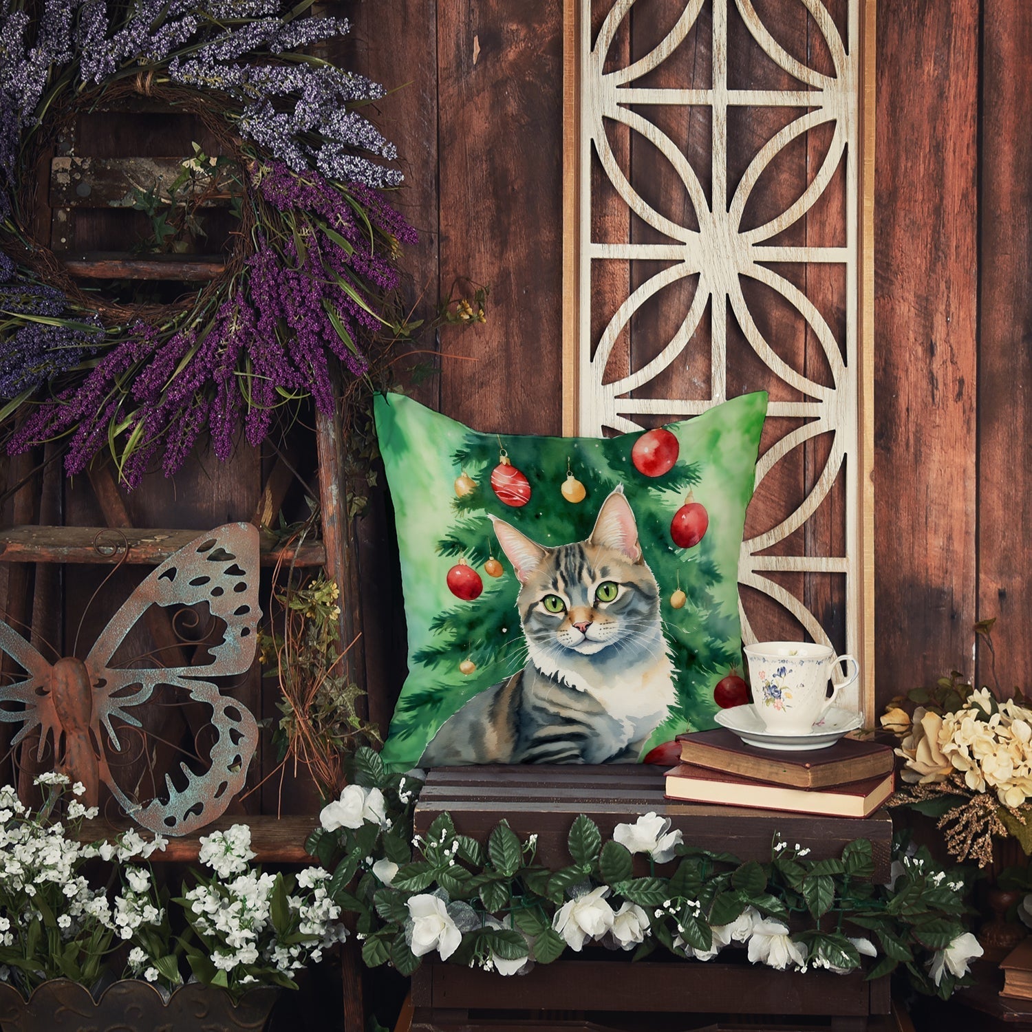 Throw Pillow featuring breed specific American Bobtail artwork. Celebrate Christmas with this Christmas Pillow. Add a touch of vibrancy and comfort to your outdoor seating with Caroline's Treasures Fabric Decorative Pillow. Measuring approximately 14 inches by 14 inches, this outdoor pillow is crafted to elevate the appeal of your patio furniture, infusing it with vivid color and artistic flair. The pillow includes a 100% Polyester Fabric sham filled with a quality pillow form to provide superior comfort. Innovatively made from Caroline's Treasures brand new material, specifically woven for its water resistance, this pillow is designed for durability. The soft canvas fabric offers versatility in use, fit for your indoor couch or your outdoor patio, porch, or veranda. The fabric is dyed with colorfast dyes built for resilience against weather conditions, ensuring the pillow retains its beauty over time. Constructed by sewing three fabric pieces to create a sham, the polyester insert is then nestled inside to form the pillow, resulting in an overstuffed pillow that maintains its shape. Both the sham and the pillow insert are proudly made in the United States. As the pillows are handcrafted, there may be minor variations in size, further enhancing their unique charm. Experience comfort in style with Caroline's Treasures Fabric Decorative Pillow.