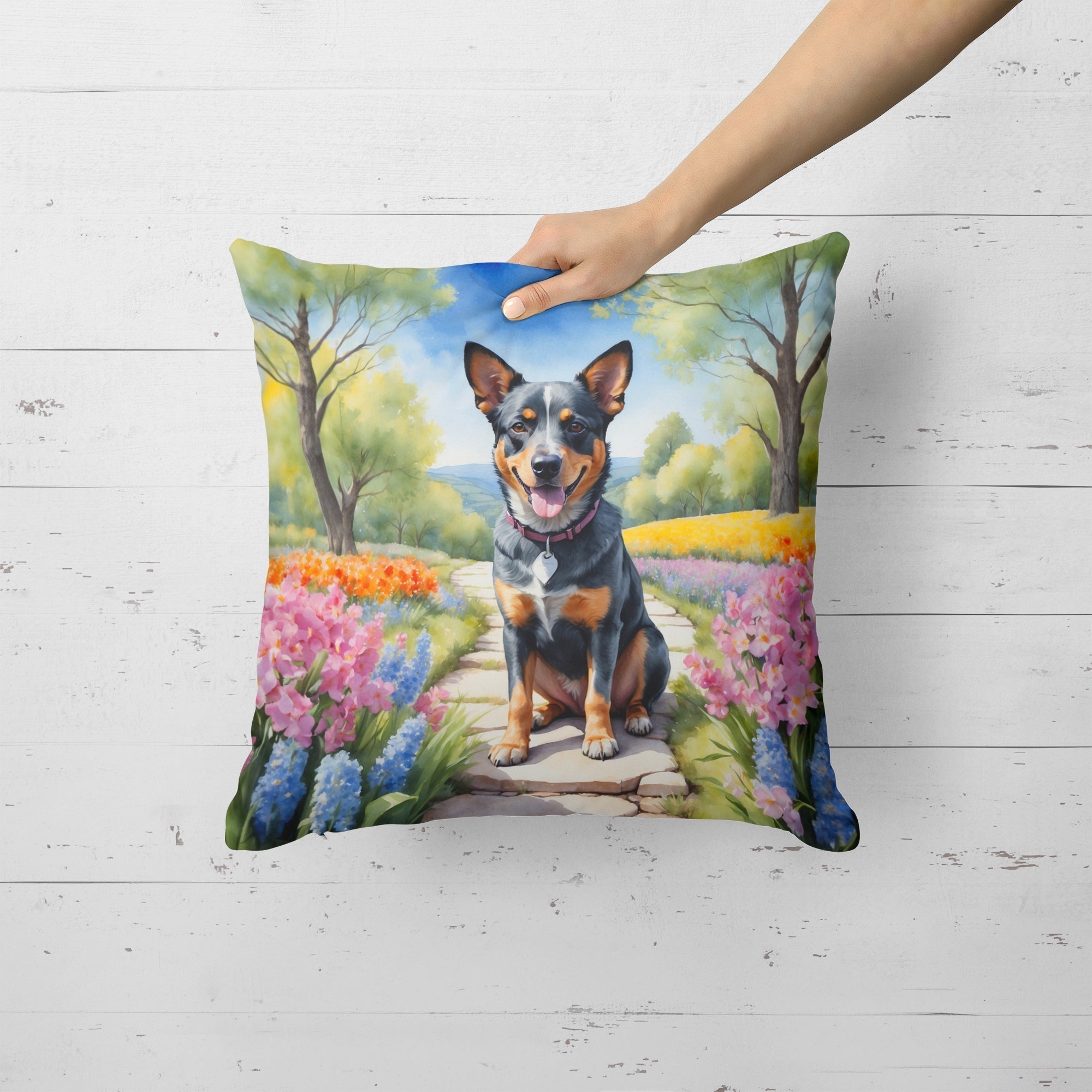 Decorate your space with Caroline's Treasures Australian Cattle Dog artwork on a Pillow. Bring a bit of Spring into your home with a Spring Pillow. Revitalize your outdoor or indoor living space with Caroline's Treasures 18x18 Fabric Decorative Pillow. With a generously sized dimension of approximately 18 inches by 18 inches, this pillow makes a comfortable and aesthetic addition to any seating area. Made from a unique, water-resistant material developed by Caroline's Treasures, the pillow sham is 100% polyester fabric that's durable and ready to weather any condition. Its vibrant, full-color artwork will not fade over time as it is dyed with color-fast dyes. Whether you place it on your patio furniture, porch, veranda, or indoor couch, its soft canvas fabric ensures a cozy experience. The pillow is handcrafted in the United States, featuring a sham created from three pieces of fabric and a polyester insert for enduring shape and overstuffed comfort. Despite being robustly built to endure the outdoors, it is as soft and snug as your favorite indoor cushions. Please note, as all Caroline's Treasures pillows are handmade, sizes may vary slightly, adding to the charm of this unique decorative item.