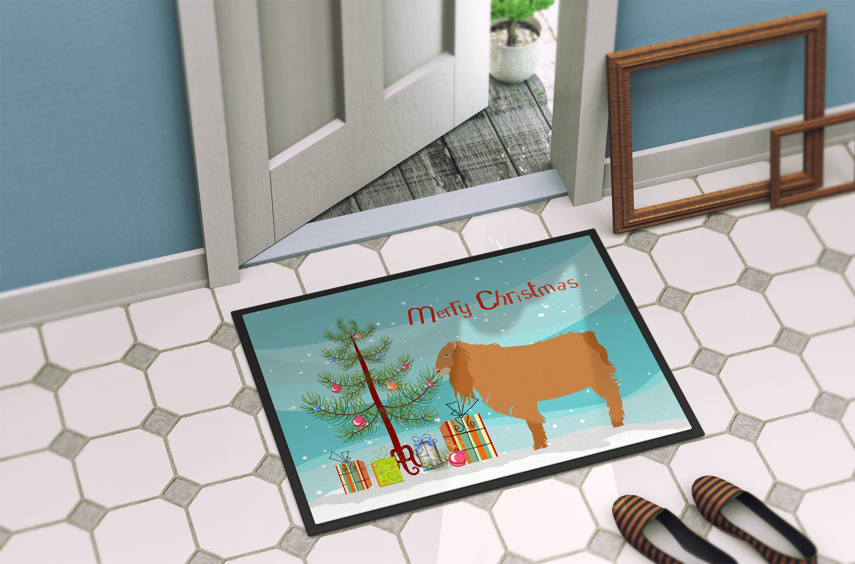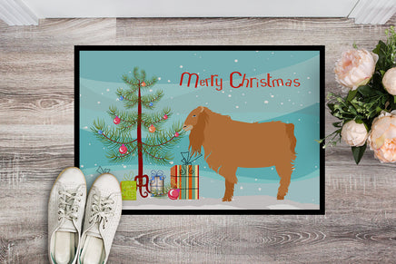 Decorate your space with Caroline's Treasures Christmas American Lamancha Goat artwork on a Doormat. Welcome your guests in style with Caroline's Treasures Artwork Door Mat, designed to withstand almost any weather condition. This mat, measuring approximately 24 by 36 inches, is held together by durable black binding tape. Its top layer, composed of polyester felt, is dyed with the eye-catching image you see on the mat. A few layers below provide the mat with stability, while its rubber bottom is stamped to help prevent slipping and ensures safety. Caroline's Treasures mat works wonderfully as both an indoor or outdoor door mat. For cleaning, simply hose it off with water or use a power washer - no need for any cleaner that produces suds. Avoid scrubbing with a brush, instead, opt for the vacuum on floor setting. Designed manufactured and printed in the USA, this mat is a perfect addition to your porch, outdoor kitchen, entryway, or any indoor space. Its unique design makes it a charming decorative rug that greets your guests and adds a stylish touch to your home decor.