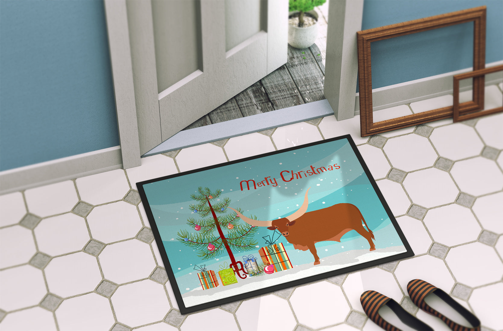 Decorate your space with Caroline's Treasures Christmas Ankole-Watusu Cow artwork on a Doormat. Welcome your guests in style with Caroline's Treasures Artwork Door Mat, designed to withstand almost any weather condition. This mat, measuring approximately 24 by 36 inches, is held together by durable black binding tape. Its top layer, composed of polyester felt, is dyed with the eye-catching image you see on the mat. A few layers below provide the mat with stability, while its rubber bottom is stamped to help prevent slipping and ensures safety. Caroline's Treasures mat works wonderfully as both an indoor or outdoor door mat. For cleaning, simply hose it off with water or use a power washer - no need for any cleaner that produces suds. Avoid scrubbing with a brush, instead, opt for the vacuum on floor setting. Designed manufactured and printed in the USA, this mat is a perfect addition to your porch, outdoor kitchen, entryway, or any indoor space. Its unique design makes it a charming decorative rug that greets your guests and adds a stylish touch to your home decor.