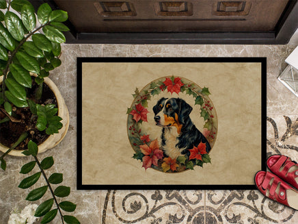Decorate your space with Caroline's Treasures Christmas Appenzeller Sennenhund artwork on a Doormat. Bring a bit of Winter into your home with a Winter Doormat. Welcome your guests in style with Caroline's Treasures Artwork Door Mat, designed to withstand almost any weather condition. This mat, measuring approximately 18 by 27 inches, is held together by durable black binding tape. Its top layer, composed of polyester felt, is dyed with the eye-catching image you see on the mat. A few layers below provide the mat with stability, while its rubber bottom is stamped to help prevent slipping and ensures safety. Caroline's Treasures mat works wonderfully as both an indoor or outdoor door mat. For cleaning, simply hose it off with water or use a power washer - no need for any cleaner that produces suds. Avoid scrubbing with a brush, instead, opt for the vacuum on floor setting. Designed manufactured and printed in the USA, this mat is a perfect addition to your porch, outdoor kitchen, entryway, or any indoor space. Its unique design makes it a charming decorative rug that greets your guests and adds a stylish touch to your home decor.