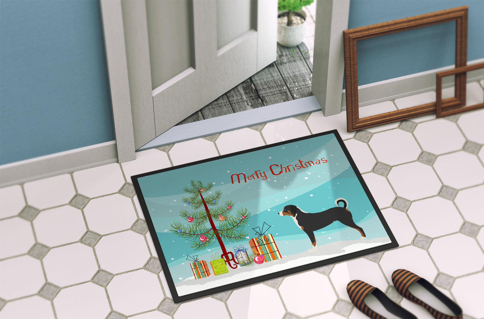 Decorate your space with Caroline's Treasures Christmas Appenzeller Sennenhund artwork on a Doormat. Welcome your guests in style with Caroline's Treasures Artwork Door Mat, designed to withstand almost any weather condition. This mat, measuring approximately 18 by 27 inches, is held together by durable black binding tape. Its top layer, composed of polyester felt, is dyed with the eye-catching image you see on the mat. A few layers below provide the mat with stability, while its rubber bottom is stamped to help prevent slipping and ensures safety. Caroline's Treasures mat works wonderfully as both an indoor or outdoor door mat. For cleaning, simply hose it off with water or use a power washer - no need for any cleaner that produces suds. Avoid scrubbing with a brush, instead, opt for the vacuum on floor setting. Designed manufactured and printed in the USA, this mat is a perfect addition to your porch, outdoor kitchen, entryway, or any indoor space. Its unique design makes it a charming decorative rug that greets your guests and adds a stylish touch to your home decor.