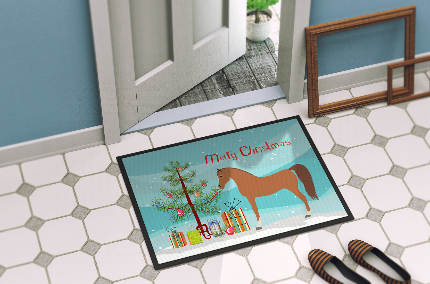 Decorate your space with Caroline's Treasures Christmas Arabian Horse artwork on a Doormat. Welcome your guests in style with Caroline's Treasures Artwork Door Mat, designed to withstand almost any weather condition. This mat, measuring approximately 24 by 36 inches, is held together by durable black binding tape. Its top layer, composed of polyester felt, is dyed with the eye-catching image you see on the mat. A few layers below provide the mat with stability, while its rubber bottom is stamped to help prevent slipping and ensures safety. Caroline's Treasures mat works wonderfully as both an indoor or outdoor door mat. For cleaning, simply hose it off with water or use a power washer - no need for any cleaner that produces suds. Avoid scrubbing with a brush, instead, opt for the vacuum on floor setting. Designed manufactured and printed in the USA, this mat is a perfect addition to your porch, outdoor kitchen, entryway, or any indoor space. Its unique design makes it a charming decorative rug that greets your guests and adds a stylish touch to your home decor.