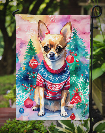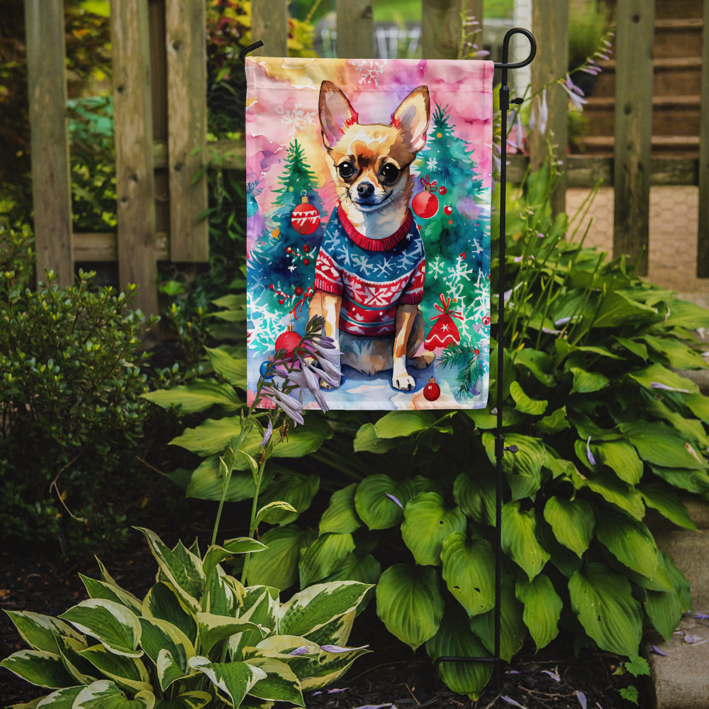 Decorate your space with Caroline's Treasures Christmas Chihuahua artwork on a Garden Flag. Enhance the beauty of your garden, patio, or yard with Caroline's Treasures Decorative Garden Flag, proudly made in the USA. Crafted from two pieces of thick, double-sided polyester fabric, this 2-ply garden flag is designed to withstand various weather conditions, making it water-resistant and weatherproof. Featuring correctly readable words on both sides, this garden flag offers a delightful visual experience from any angle. With its heavier weight, it stands out among other garden flags, ensuring stability and durability even in wind, rain, and snow. Measuring approximately 11 1/4 inches by 15 1/2 inches, this flag allows you to personalize your outdoor decor. It comes with a 1 1/2-inch sleeve sewn in, allowing easy attachment to any standard garden flag stand or garden size porch hanger (sold separately). Make a statement in your outdoor space with Caroline's Treasures Decorative Garden Flag, a vibrant and high-quality flag that adds color and personality to your surroundings. Proudly made in the USA, it's a symbol of quality craftsmanship and attention to detail.