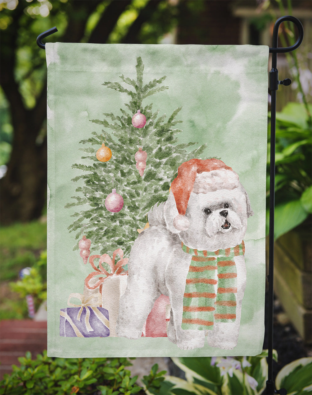Decorate your space with Caroline's Treasures Christmas Bichon Frise artwork on a Garden Flag. Enhance the beauty of your garden, patio, or yard with Caroline's Treasures Decorative Garden Flag, proudly made in the USA. Crafted from two pieces of thick, double-sided polyester fabric, this 2-ply garden flag is designed to withstand various weather conditions, making it water-resistant and weatherproof. Featuring correctly readable words on both sides, this garden flag offers a delightful visual experience from any angle. With its heavier weight, it stands out among other garden flags, ensuring stability and durability even in wind, rain, and snow. Measuring approximately 11 1/4 inches by 15 1/2 inches, this flag allows you to personalize your outdoor decor. It comes with a 1 1/2-inch sleeve sewn in, allowing easy attachment to any standard garden flag stand or garden size porch hanger (sold separately). Make a statement in your outdoor space with Caroline's Treasures Decorative Garden Flag, a vibrant and high-quality flag that adds color and personality to your surroundings. Proudly made in the USA, it's a symbol of quality craftsmanship and attention to detail.