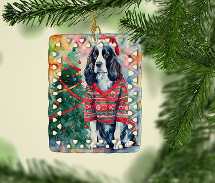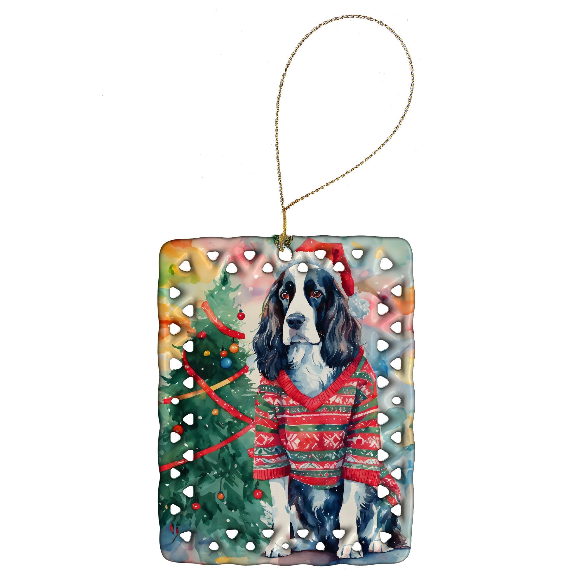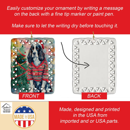 Porcelain Ornament featuring breed specific English Springer Spaniel artwork. Celebrate Christmas with this Christmas Ornament. Add a unique, personal touch to your holiday decor with Caroline's Treasures Rectangular Lattice Porcelain Ornament. Perfect for creating cherished memories, this high-quality ornament shines under festive lights, reflecting warmth and joy throughout your Christmas tree. Crafted with a glossy finish, it showcases vibrant, full-color artwork contributed by Caroline's Treasures talented artists, ensuring your tree is adorned with a burst of color and holiday spirit. What sets this Porcelain Ornament apart is its customizable white back. Use a paint pen or permanent marker to write a heartfelt message, commemorate a special year, or mark an unforgettable date, turning this ornament into a keepsake that will be treasured for years to come. For best results, allow any personalization to dry thoroughly before handling. Each ornament comes complete with a delicate gold cord, making it easy to hang and display. Proudly made in the USA, this ornament measures 3.375 x 2.625 inches and is a thoughtful gift for pet sitters, teachers, family members, or anyone who would appreciate a little extra holiday magic. Bring style, charm, and a touch of personal meaning to your Christmas tree with this beautifully designed ornament..