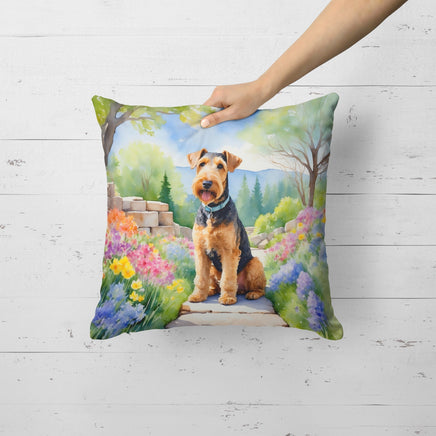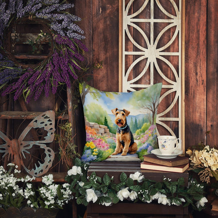 Decorate your space with Caroline's Treasures Airedale Terrier artwork on a Pillow. Bring a bit of Spring into your home with a Spring Pillow. Revitalize your outdoor or indoor living space with Caroline's Treasures 18x18 Fabric Decorative Pillow. With a generously sized dimension of approximately 18 inches by 18 inches, this pillow makes a comfortable and aesthetic addition to any seating area. Made from a unique, water-resistant material developed by Caroline's Treasures, the pillow sham is 100% polyester fabric that's durable and ready to weather any condition. Its vibrant, full-color artwork will not fade over time as it is dyed with color-fast dyes. Whether you place it on your patio furniture, porch, veranda, or indoor couch, its soft canvas fabric ensures a cozy experience. The pillow is handcrafted in the United States, featuring a sham created from three pieces of fabric and a polyester insert for enduring shape and overstuffed comfort. Despite being robustly built to endure the outdoors, it is as soft and snug as your favorite indoor cushions. Please note, as all Caroline's Treasures pillows are handmade, sizes may vary slightly, adding to the charm of this unique decorative item.