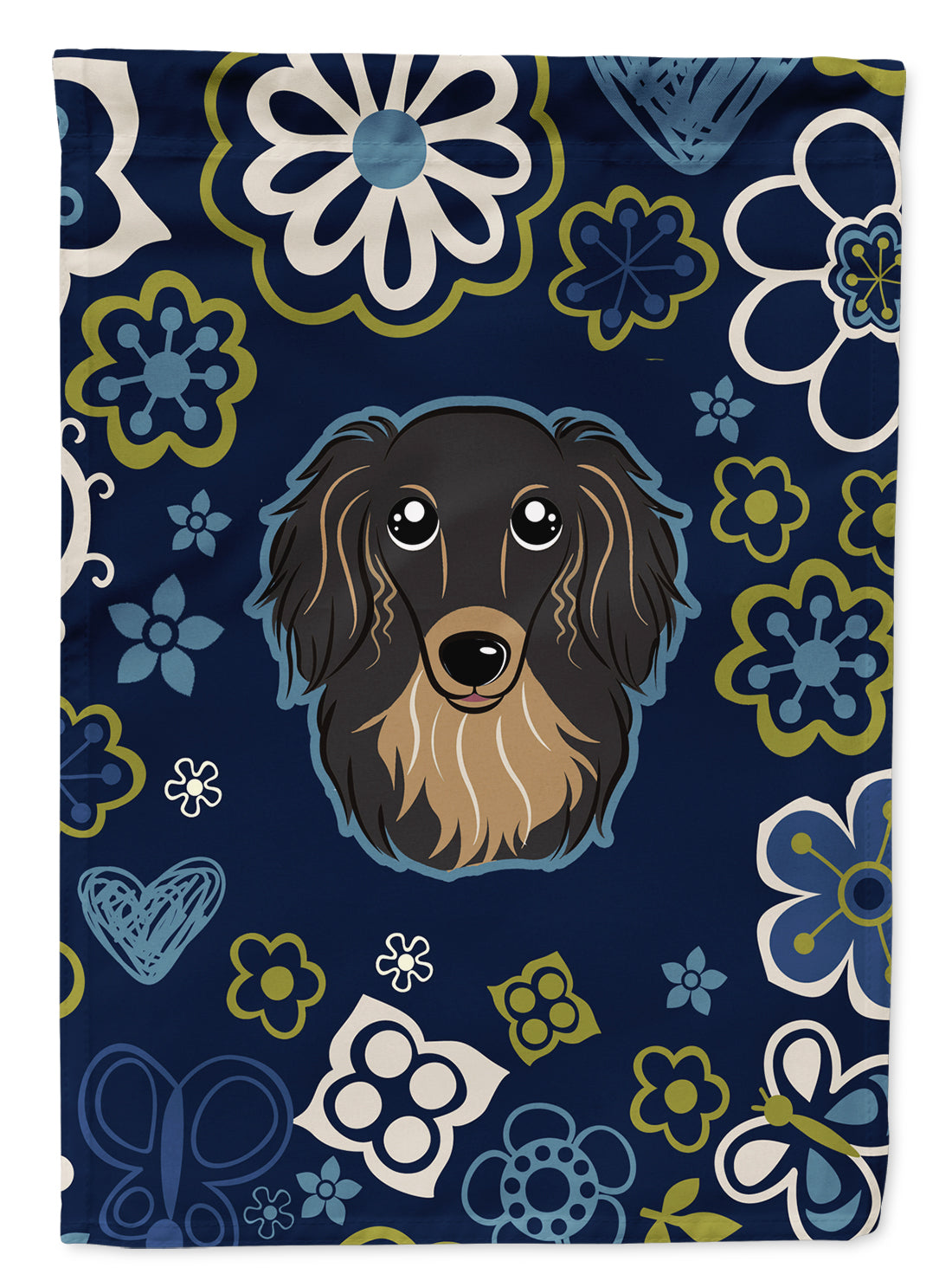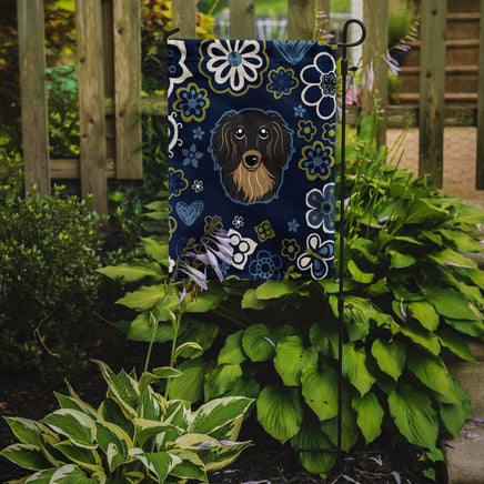 Blue Flowers Longhair Black and Tan Dachshund Flag Garden Size BB5064GF