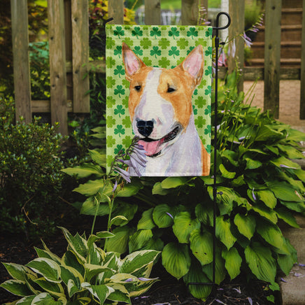 Decorate your space with Caroline's Treasures St Patrick's Day Bull Terrier artwork on a Garden Flag. Enhance the beauty of your garden, patio, or yard with Caroline's Treasures Decorative Garden Flag, proudly made in the USA. Crafted from two pieces of thick, double-sided polyester fabric, this 2-ply garden flag is designed to withstand various weather conditions, making it water-resistant and weatherproof. Featuring correctly readable words on both sides, this garden flag offers a delightful visual experience from any angle. With its heavier weight, it stands out among other garden flags, ensuring stability and durability even in wind, rain, and snow. Measuring approximately 11 1/4 inches by 15 1/2 inches, this flag allows you to personalize your outdoor decor. It comes with a 1 1/2-inch sleeve sewn in, allowing easy attachment to any standard garden flag stand or garden size porch hanger (sold separately). Make a statement in your outdoor space with Caroline's Treasures Decorative Garden Flag, a vibrant and high-quality flag that adds color and personality to your surroundings. Proudly made in the USA, it's a symbol of quality craftsmanship and attention to detail.