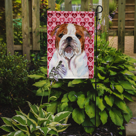 Decorate your space with Caroline's Treasures Valentine's Day Bulldog, English Bulldog artwork on a Garden Flag. Enhance the beauty of your garden, patio, or yard with Caroline's Treasures Decorative Garden Flag, proudly made in the USA. Crafted from two pieces of thick, double-sided polyester fabric, this 2-ply garden flag is designed to withstand various weather conditions, making it water-resistant and weatherproof. Featuring correctly readable words on both sides, this garden flag offers a delightful visual experience from any angle. With its heavier weight, it stands out among other garden flags, ensuring stability and durability even in wind, rain, and snow. Measuring approximately 11 1/4 inches by 15 1/2 inches, this flag allows you to personalize your outdoor decor. It comes with a 1 1/2-inch sleeve sewn in, allowing easy attachment to any standard garden flag stand or garden size porch hanger (sold separately). Make a statement in your outdoor space with Caroline's Treasures Decorative Garden Flag, a vibrant and high-quality flag that adds color and personality to your surroundings. Proudly made in the USA, it's a symbol of quality craftsmanship and attention to detail.