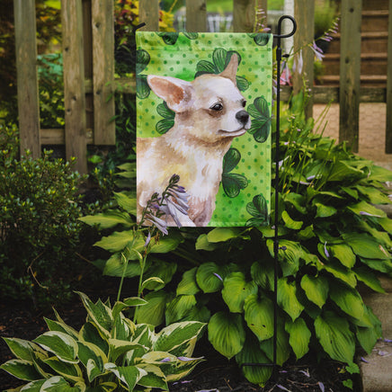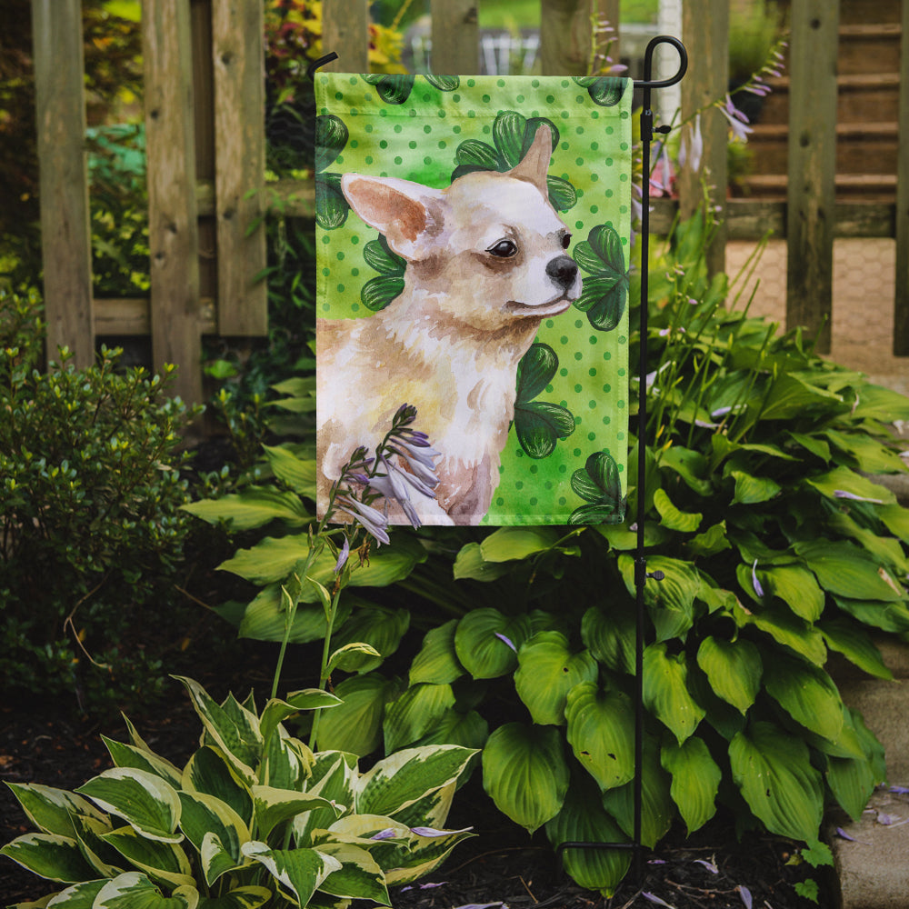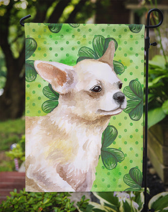 Decorate your space with Caroline's Treasures St Patrick's Day Chihuahua artwork on a Garden Flag. Enhance the beauty of your garden, patio, or yard with Caroline's Treasures Decorative Garden Flag, proudly made in the USA. Crafted from two pieces of thick, double-sided polyester fabric, this 2-ply garden flag is designed to withstand various weather conditions, making it water-resistant and weatherproof. Featuring correctly readable words on both sides, this garden flag offers a delightful visual experience from any angle. With its heavier weight, it stands out among other garden flags, ensuring stability and durability even in wind, rain, and snow. Measuring approximately 11 1/4 inches by 15 1/2 inches, this flag allows you to personalize your outdoor decor. It comes with a 1 1/2-inch sleeve sewn in, allowing easy attachment to any standard garden flag stand or garden size porch hanger (sold separately). Make a statement in your outdoor space with Caroline's Treasures Decorative Garden Flag, a vibrant and high-quality flag that adds color and personality to your surroundings. Proudly made in the USA, it's a symbol of quality craftsmanship and attention to detail.