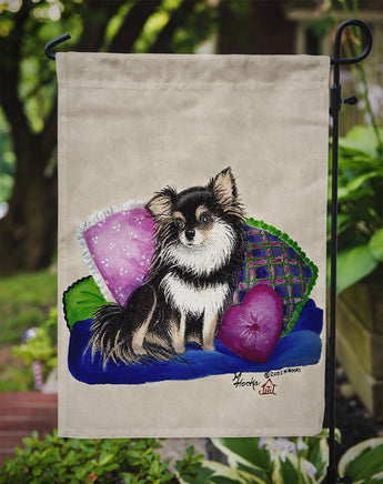 Decorate your space with Caroline's Treasures Chihuahua artwork on a Garden Flag. Enhance the beauty of your garden, patio, or yard with Caroline's Treasures Decorative Garden Flag, proudly made in the USA. Crafted from two pieces of thick, double-sided polyester fabric, this 2-ply garden flag is designed to withstand various weather conditions, making it water-resistant and weatherproof. Featuring correctly readable words on both sides, this garden flag offers a delightful visual experience from any angle. With its heavier weight, it stands out among other garden flags, ensuring stability and durability even in wind, rain, and snow. Measuring approximately 11 1/4 inches by 15 1/2 inches, this flag allows you to personalize your outdoor decor. It comes with a 1 1/2-inch sleeve sewn in, allowing easy attachment to any standard garden flag stand or garden size porch hanger (sold separately). Make a statement in your outdoor space with Caroline's Treasures Decorative Garden Flag, a vibrant and high-quality flag that adds color and personality to your surroundings. Proudly made in the USA, it's a symbol of quality craftsmanship and attention to detail.