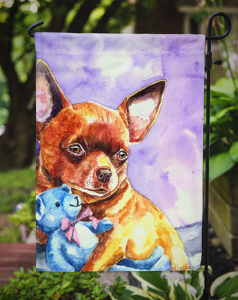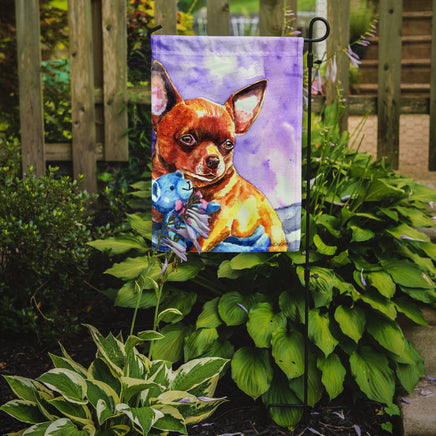 Decorate your space with Caroline's Treasures Chihuahua artwork on a Garden Flag. Enhance the beauty of your garden, patio, or yard with Caroline's Treasures Decorative Garden Flag, proudly made in the USA. Crafted from two pieces of thick, double-sided polyester fabric, this 2-ply garden flag is designed to withstand various weather conditions, making it water-resistant and weatherproof. Featuring correctly readable words on both sides, this garden flag offers a delightful visual experience from any angle. With its heavier weight, it stands out among other garden flags, ensuring stability and durability even in wind, rain, and snow. Measuring approximately 11 1/4 inches by 15 1/2 inches, this flag allows you to personalize your outdoor decor. It comes with a 1 1/2-inch sleeve sewn in, allowing easy attachment to any standard garden flag stand or garden size porch hanger (sold separately). Make a statement in your outdoor space with Caroline's Treasures Decorative Garden Flag, a vibrant and high-quality flag that adds color and personality to your surroundings. Proudly made in the USA, it's a symbol of quality craftsmanship and attention to detail.