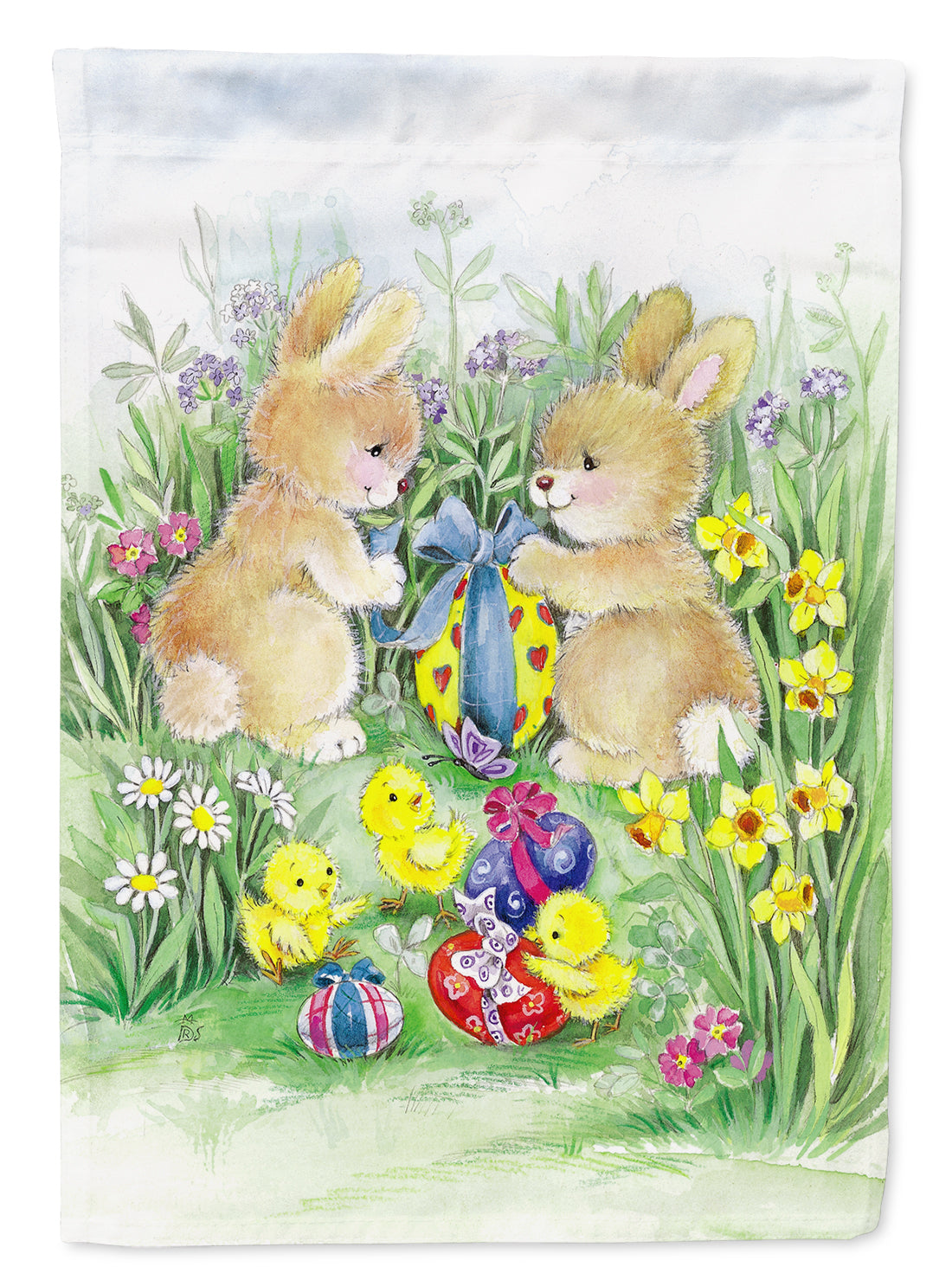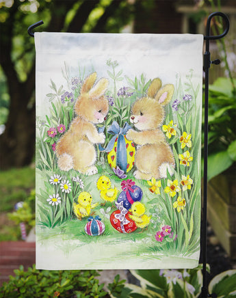 Decorate your space with Caroline's Treasures Easter artwork on a Garden Flag. Enhance the beauty of your garden, patio, or yard with Caroline's Treasures Decorative Garden Flag, proudly made in the USA. Crafted from two pieces of thick, double-sided polyester fabric, this 2-ply garden flag is designed to withstand various weather conditions, making it water-resistant and weatherproof. Featuring correctly readable words on both sides, this garden flag offers a delightful visual experience from any angle. With its heavier weight, it stands out among other garden flags, ensuring stability and durability even in wind, rain, and snow. Measuring approximately 11 1/4 inches by 15 1/2 inches, this flag allows you to personalize your outdoor decor. It comes with a 1 1/2-inch sleeve sewn in, allowing easy attachment to any standard garden flag stand or garden size porch hanger (sold separately). Make a statement in your outdoor space with Caroline's Treasures Decorative Garden Flag, a vibrant and high-quality flag that adds color and personality to your surroundings. Proudly made in the USA, it's a symbol of quality craftsmanship and attention to detail.