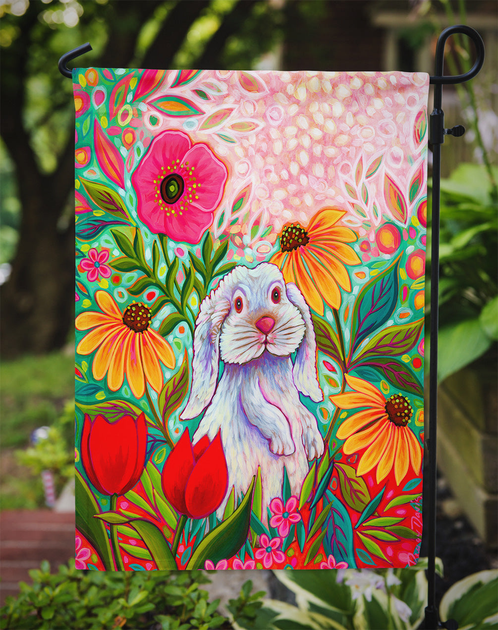 Decorate your space with Caroline's Treasures Easter Rabbit artwork on a Garden Flag. Bring a bit of Spring into your home with a Spring Garden Flag. Enhance the beauty of your garden, patio, or yard with Caroline's Treasures Decorative Garden Flag, proudly made in the USA. Crafted from two pieces of thick, double-sided polyester fabric, this 2-ply garden flag is designed to withstand various weather conditions, making it water-resistant and weatherproof. Featuring correctly readable words on both sides, this garden flag offers a delightful visual experience from any angle. With its heavier weight, it stands out among other garden flags, ensuring stability and durability even in wind, rain, and snow. Measuring approximately 11 1/4 inches by 15 1/2 inches, this flag allows you to personalize your outdoor decor. It comes with a 1 1/2-inch sleeve sewn in, allowing easy attachment to any standard garden flag stand or garden size porch hanger (sold separately). Make a statement in your outdoor space with Caroline's Treasures Decorative Garden Flag, a vibrant and high-quality flag that adds color and personality to your surroundings. Proudly made in the USA, it's a symbol of quality craftsmanship and attention to detail.