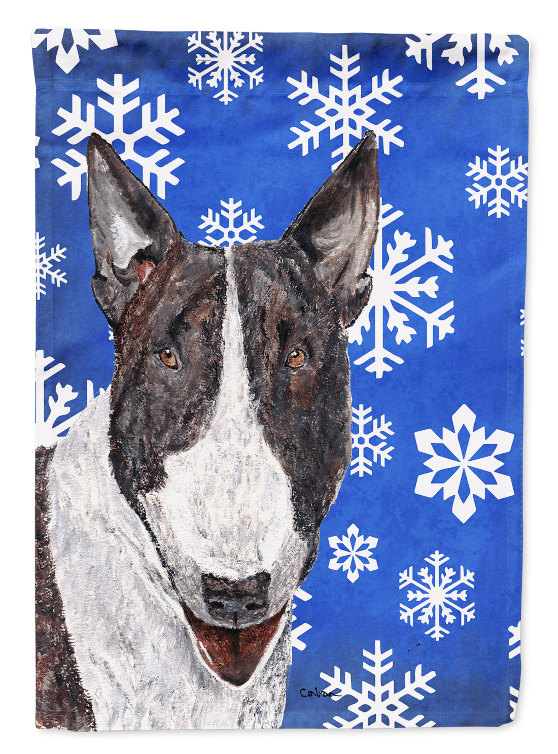 Decorate your space with our Christmas Bull Terrier artwork on a Garden Flag. Bring a bit of Winter into your home with a Winter Garden Flag. Enhance the beauty of your garden, patio, or yard with Caroline's Treasures Decorative Garden Flag, proudly made in the USA. Crafted from two pieces of thick, double-sided polyester fabric, this 2-ply garden flag is designed to withstand various weather conditions, making it water-resistant and weatherproof. Featuring correctly readable words on both sides, this garden flag offers a delightful visual experience from any angle. With its heavier weight, it stands out among other garden flags, ensuring stability and durability even in wind, rain, and snow. Measuring approximately 11 1/4 inches by 15 1/2 inches, this flag allows you to personalize your outdoor decor. It comes with a 1 1/2-inch sleeve sewn in, allowing easy attachment to any standard garden flag stand or garden size porch hanger (sold separately). Make a statement in your outdoor space with Caroline's Treasures Decorative Garden Flag, a vibrant and high-quality flag that adds color and personality to your surroundings. Proudly made in the USA, it's a symbol of quality craftsmanship and attention to detail.