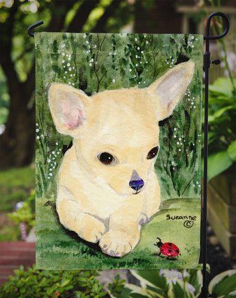 Decorate your space with our Chihuahua artwork on a Garden Flag. Enhance the beauty of your garden, patio, or yard with Caroline's Treasures Decorative Garden Flag, proudly made in the USA. Crafted from two pieces of thick, double-sided polyester fabric, this 2-ply garden flag is designed to withstand various weather conditions, making it water-resistant and weatherproof. Featuring correctly readable words on both sides, this garden flag offers a delightful visual experience from any angle. With its heavier weight, it stands out among other garden flags, ensuring stability and durability even in wind, rain, and snow. Measuring approximately 11 1/4 inches by 15 1/2 inches, this flag allows you to personalize your outdoor decor. It comes with a 1 1/2-inch sleeve sewn in, allowing easy attachment to any standard garden flag stand or garden size porch hanger (sold separately). Make a statement in your outdoor space with Caroline's Treasures Decorative Garden Flag, a vibrant and high-quality flag that adds color and personality to your surroundings. Proudly made in the USA, it's a symbol of quality craftsmanship and attention to detail.