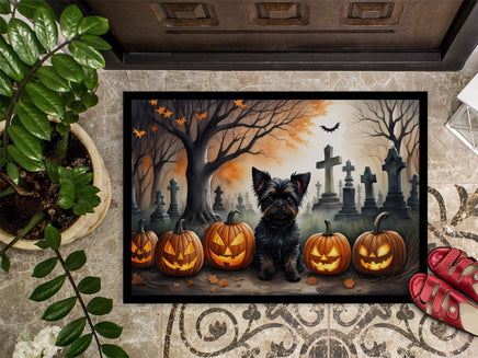 Decorate your space with our Halloween Affenpinscher artwork on a Doormat. Welcome your guests in style with our Artwork Door Mat, designed to withstand almost any weather condition. This mat, measuring approximately 24 by 36 inches, is held together by durable black binding tape. Its top layer, composed of polyester felt, is dyed with the eye-catching image you see on the mat. A few layers below provide the mat with stability, while its rubber bottom is stamped to help prevent slipping and ensures safety. Our mat works wonderfully as both an indoor or outdoor door mat. For cleaning, simply hose it off with water or use a power washer - no need for any cleaner that produces suds. Avoid scrubbing with a brush, instead, opt for the vacuum on floor setting. Designed manufactured and printed in the USA, this mat is a perfect addition to your porch, outdoor kitchen, entryway, or any indoor space. Its unique design makes it a charming decorative rug that greets your guests and adds a stylish touch to your home decor.