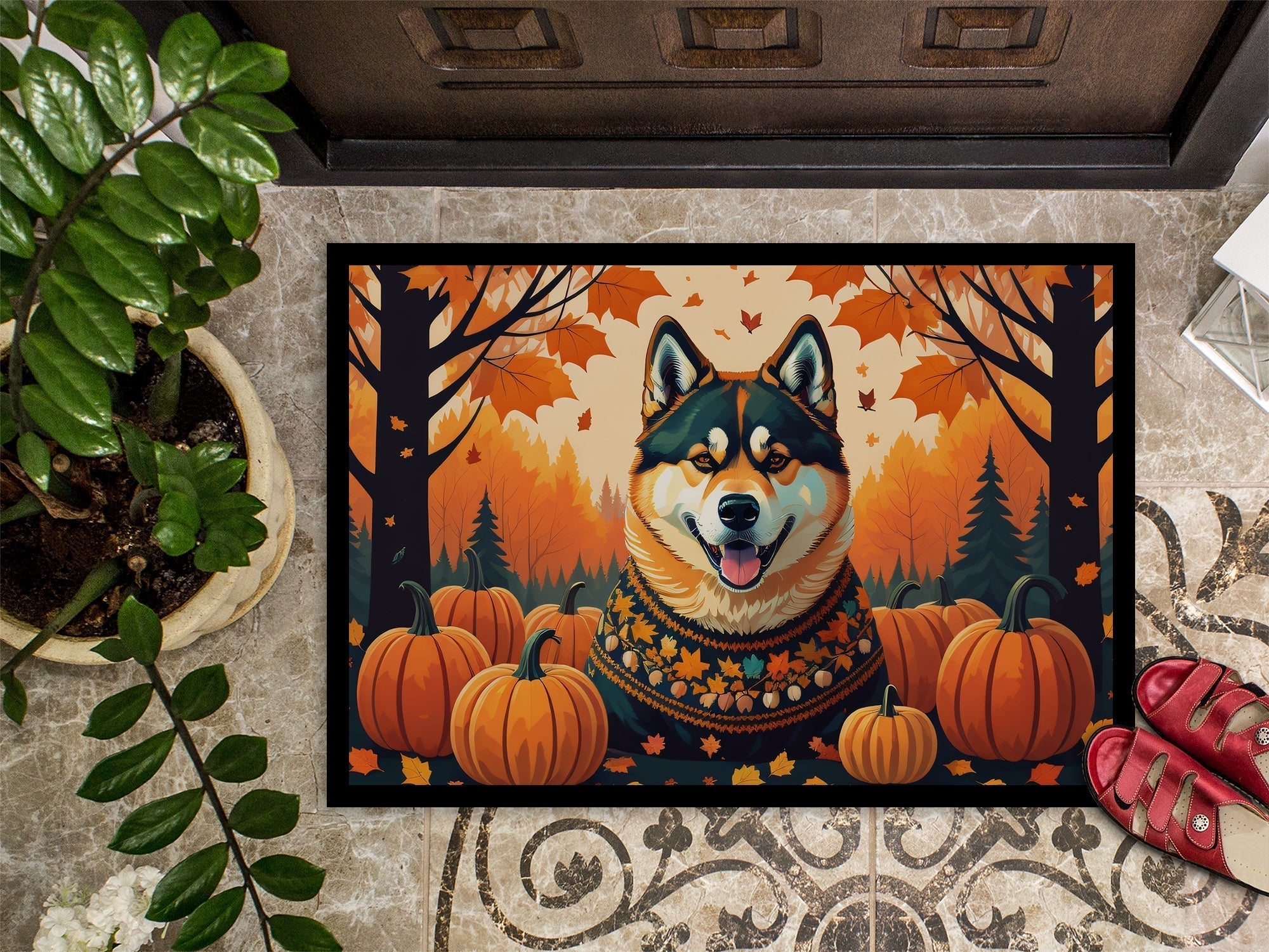 Decorate your space with our Akita artwork on a Doormat. Bring a bit of Fall into your home with a Fall Doormat. Welcome your guests in style with our Artwork Door Mat, designed to withstand almost any weather condition. This mat, measuring approximately 24 by 36 inches, is held together by durable black binding tape. Its top layer, composed of polyester felt, is dyed with the eye-catching image you see on the mat. A few layers below provide the mat with stability, while its rubber bottom is stamped to help prevent slipping and ensures safety. Our mat works wonderfully as both an indoor or outdoor door mat. For cleaning, simply hose it off with water or use a power washer - no need for any cleaner that produces suds. Avoid scrubbing with a brush, instead, opt for the vacuum on floor setting. Designed manufactured and printed in the USA, this mat is a perfect addition to your porch, outdoor kitchen, entryway, or any indoor space. Its unique design makes it a charming decorative rug that greets your guests and adds a stylish touch to your home decor.