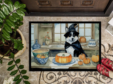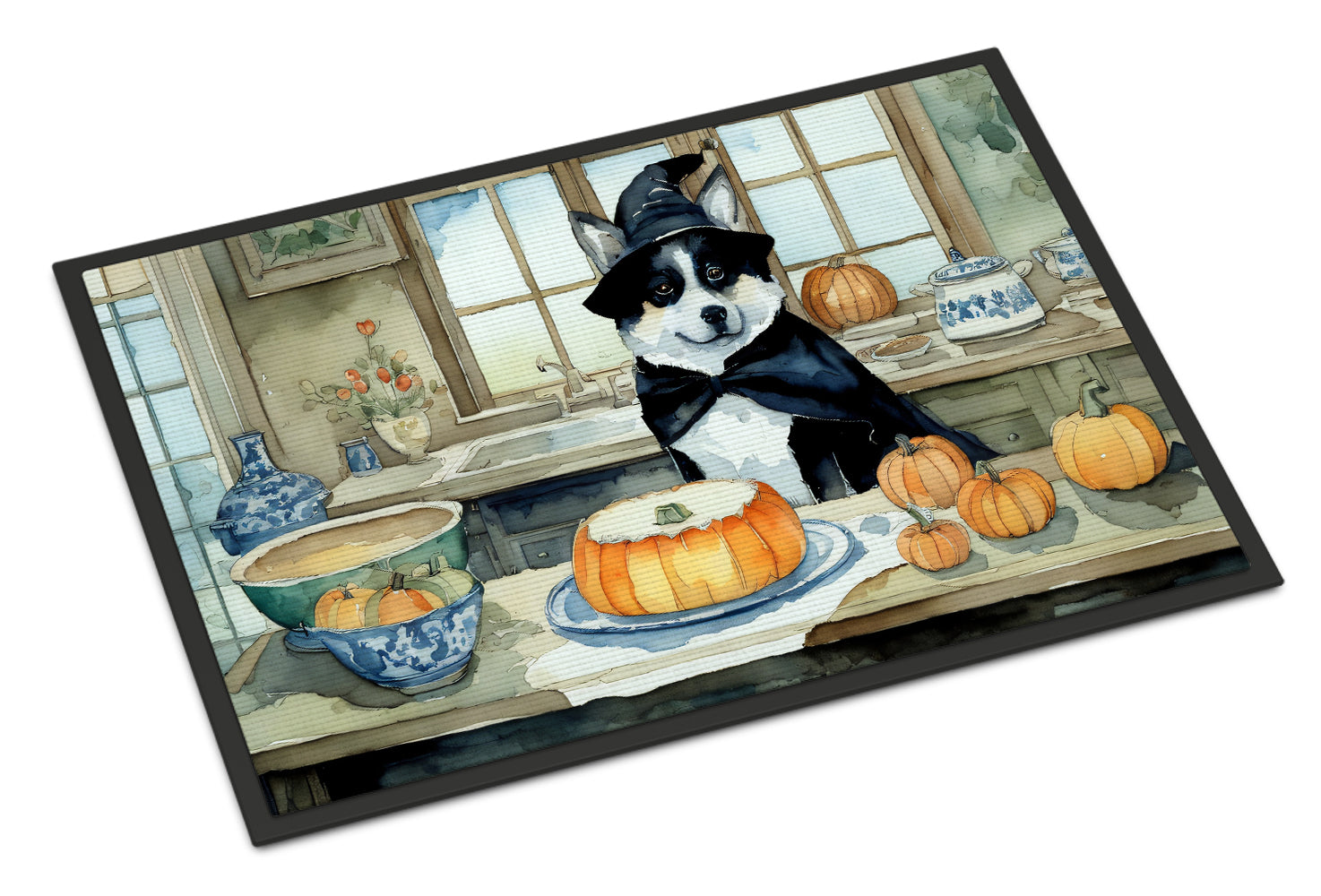 Decorate your space with our Halloween Akita artwork on a Doormat. Bring a bit of Fall into your home with a Fall Doormat. Welcome your guests in style with our Artwork Door Mat, designed to withstand almost any weather condition. This mat, measuring approximately 18 by 27 inches, is held together by durable black binding tape. Its top layer, composed of polyester felt, is dyed with the eye-catching image you see on the mat. A few layers below provide the mat with stability, while its rubber bottom is stamped to help prevent slipping and ensures safety. Our mat works wonderfully as both an indoor or outdoor door mat. For cleaning, simply hose it off with water or use a power washer - no need for any cleaner that produces suds. Avoid scrubbing with a brush, instead, opt for the vacuum on floor setting. Designed manufactured and printed in the USA, this mat is a perfect addition to your porch, outdoor kitchen, entryway, or any indoor space. Its unique design makes it a charming decorative rug that greets your guests and adds a stylish touch to your home decor.
