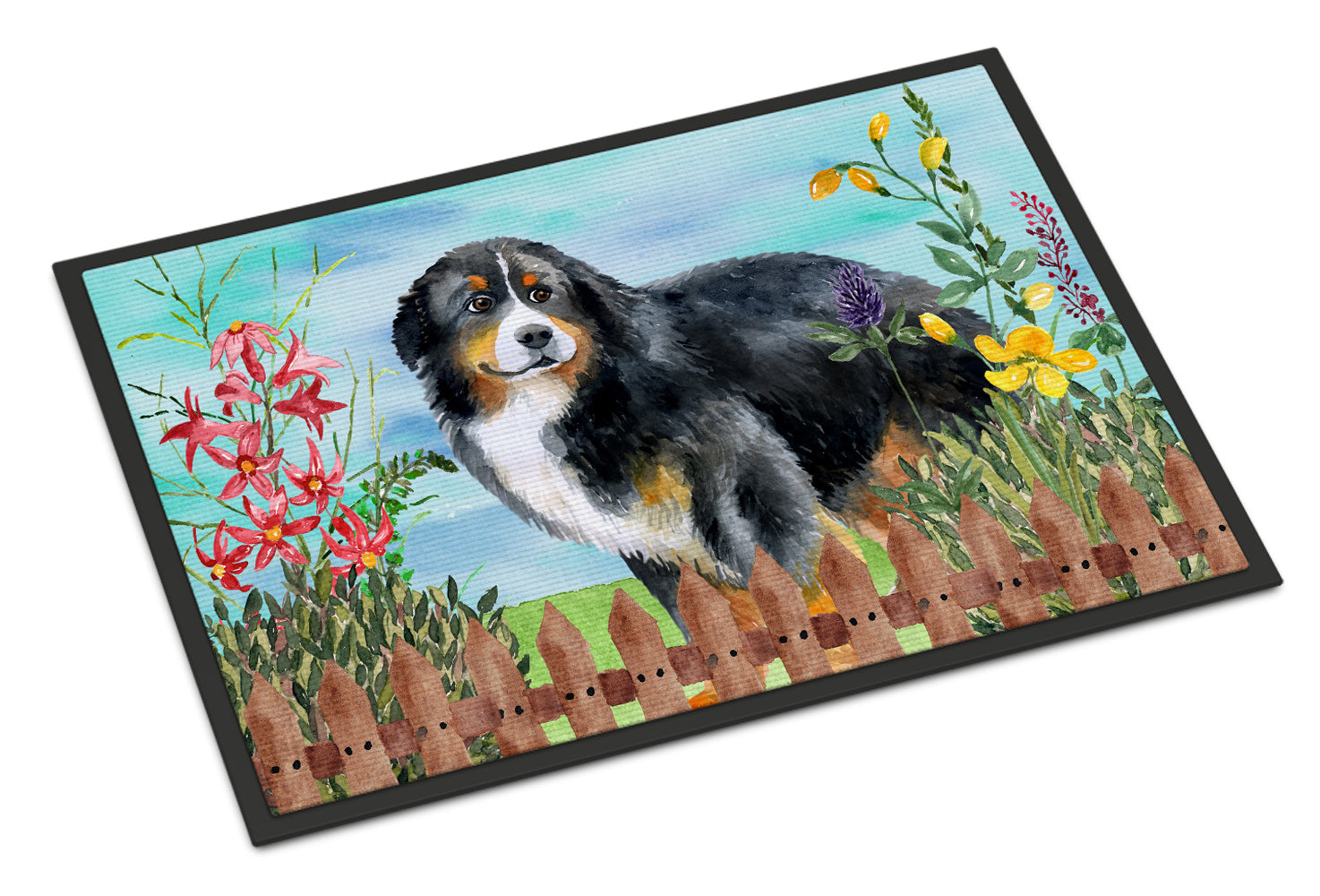 Decorate your space with Caroline's Treasures Bernese Mountain Dog artwork on a Doormat. Bring a bit of Spring into your home with a Spring Doormat. Welcome your guests in style with Caroline's Treasures Artwork Door Mat, designed to withstand almost any weather condition. This mat, measuring approximately 18 by 27 inches, is held together by durable black binding tape. Its top layer, composed of polyester felt, is dyed with the eye-catching image you see on the mat. A few layers below provide the mat with stability, while its rubber bottom is stamped to help prevent slipping and ensures safety. Caroline's Treasures mat works wonderfully as both an indoor or outdoor door mat. For cleaning, simply hose it off with water or use a power washer - no need for any cleaner that produces suds. Avoid scrubbing with a brush, instead, opt for the vacuum on floor setting. Designed manufactured and printed in the USA, this mat is a perfect addition to your porch, outdoor kitchen, entryway, or any indoor space. Its unique design makes it a charming decorative rug that greets your guests and adds a stylish touch to your home decor.