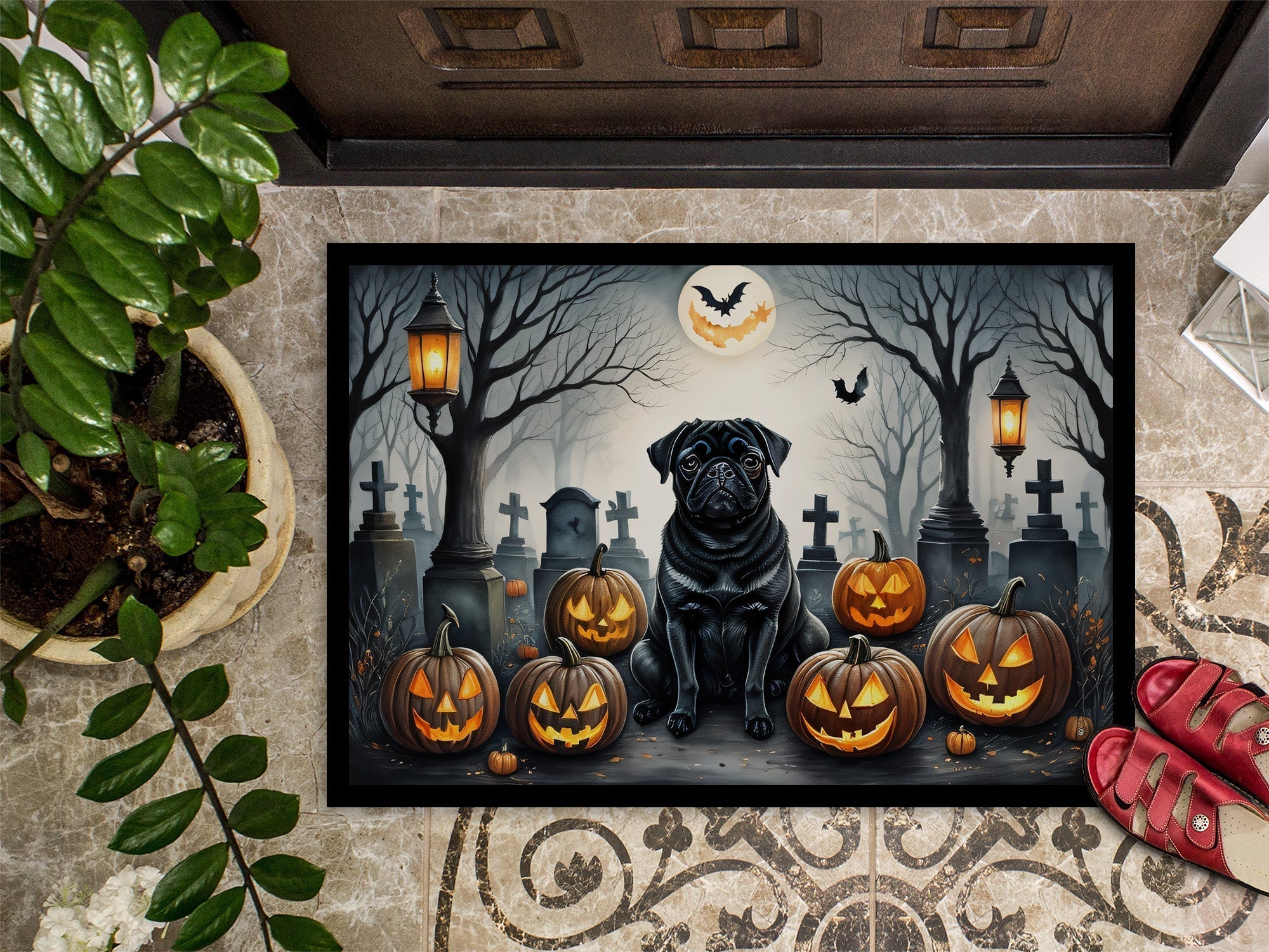 Decorate your space with our Halloween Pug artwork on a Doormat. Welcome your guests in style with our Artwork Door Mat, designed to withstand almost any weather condition. This mat, measuring approximately 18 by 27 inches, is held together by durable black binding tape. Its top layer, composed of polyester felt, is dyed with the eye-catching image you see on the mat. A few layers below provide the mat with stability, while its rubber bottom is stamped to help prevent slipping and ensures safety. Our mat works wonderfully as both an indoor or outdoor door mat. For cleaning, simply hose it off with water or use a power washer - no need for any cleaner that produces suds. Avoid scrubbing with a brush, instead, opt for the vacuum on floor setting. Designed manufactured and printed in the USA, this mat is a perfect addition to your porch, outdoor kitchen, entryway, or any indoor space. Its unique design makes it a charming decorative rug that greets your guests and adds a stylish touch to your home decor.