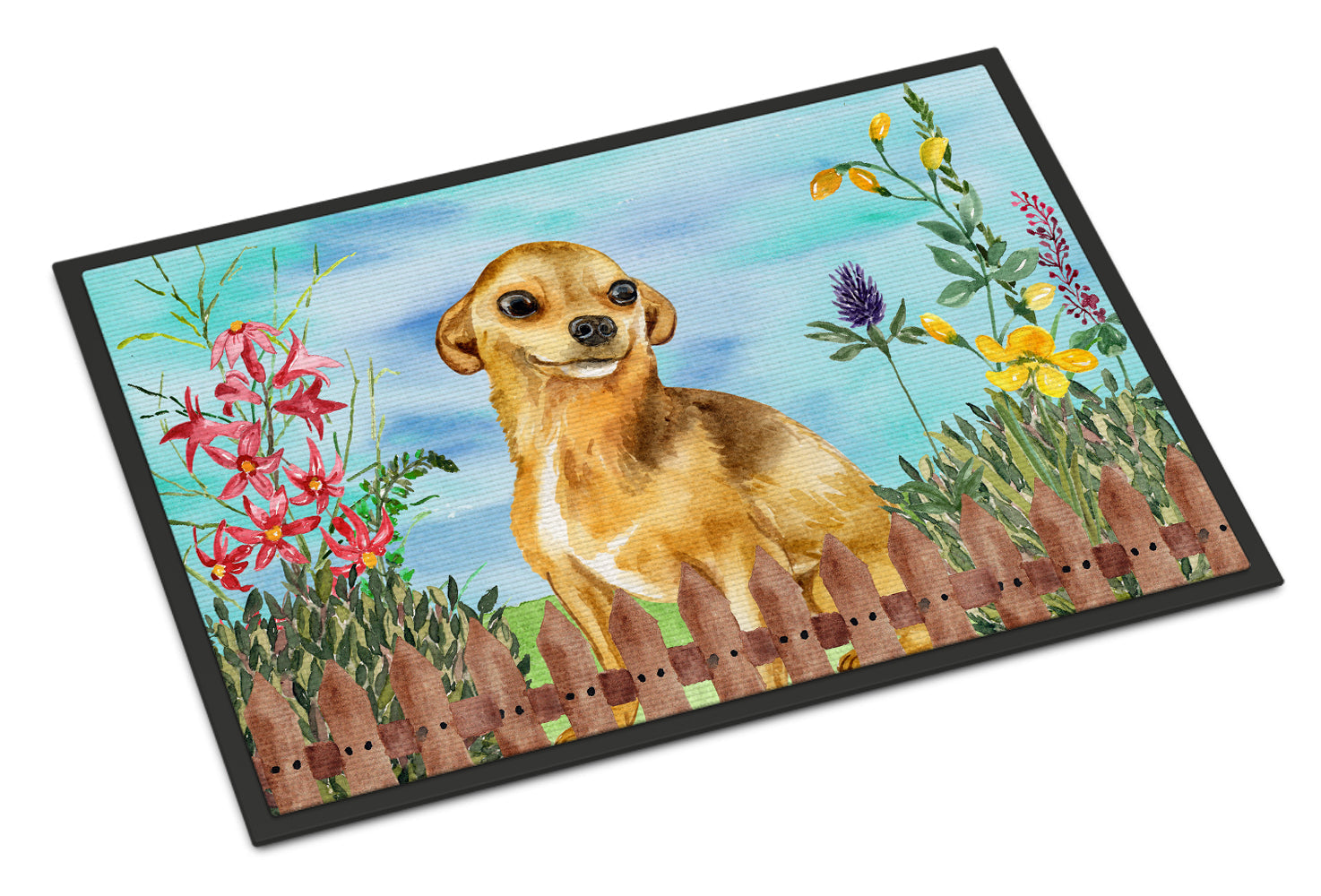 Decorate your space with Caroline's Treasures Chihuahua artwork on a Doormat. Bring a bit of Spring into your home with a Spring Doormat. Welcome your guests in style with Caroline's Treasures Artwork Door Mat, designed to withstand almost any weather condition. This mat, measuring approximately 18 by 27 inches, is held together by durable black binding tape. Its top layer, composed of polyester felt, is dyed with the eye-catching image you see on the mat. A few layers below provide the mat with stability, while its rubber bottom is stamped to help prevent slipping and ensures safety. Caroline's Treasures mat works wonderfully as both an indoor or outdoor door mat. For cleaning, simply hose it off with water or use a power washer - no need for any cleaner that produces suds. Avoid scrubbing with a brush, instead, opt for the vacuum on floor setting. Designed manufactured and printed in the USA, this mat is a perfect addition to your porch, outdoor kitchen, entryway, or any indoor space. Its unique design makes it a charming decorative rug that greets your guests and adds a stylish touch to your home decor.