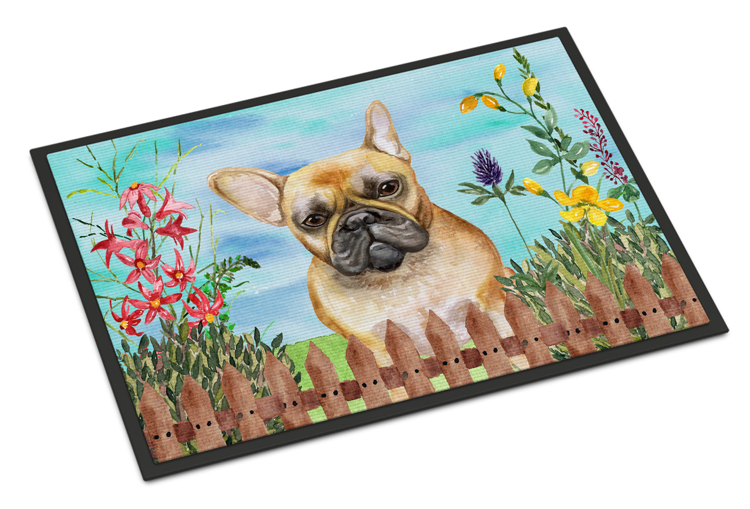 Decorate your space with Caroline's Treasures French Bulldog artwork on a Doormat. Bring a bit of Spring into your home with a Spring Doormat. Welcome your guests in style with Caroline's Treasures Artwork Door Mat, designed to withstand almost any weather condition. This mat, measuring approximately 18 by 27 inches, is held together by durable black binding tape. Its top layer, composed of polyester felt, is dyed with the eye-catching image you see on the mat. A few layers below provide the mat with stability, while its rubber bottom is stamped to help prevent slipping and ensures safety. Caroline's Treasures mat works wonderfully as both an indoor or outdoor door mat. For cleaning, simply hose it off with water or use a power washer - no need for any cleaner that produces suds. Avoid scrubbing with a brush, instead, opt for the vacuum on floor setting. Designed manufactured and printed in the USA, this mat is a perfect addition to your porch, outdoor kitchen, entryway, or any indoor space. Its unique design makes it a charming decorative rug that greets your guests and adds a stylish touch to your home decor.
