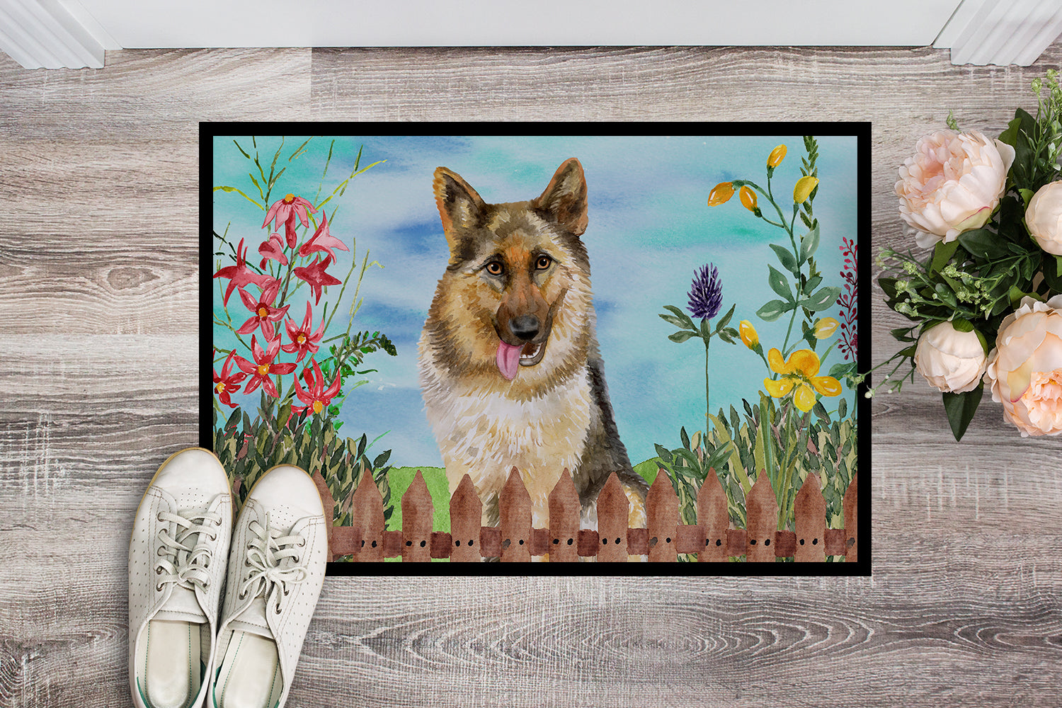 Decorate your space with Caroline's Treasures German Shepherd artwork on a Doormat. Bring a bit of Spring into your home with a Spring Doormat. Welcome your guests in style with Caroline's Treasures Artwork Door Mat, designed to withstand almost any weather condition. This mat, measuring approximately 18 by 27 inches, is held together by durable black binding tape. Its top layer, composed of polyester felt, is dyed with the eye-catching image you see on the mat. A few layers below provide the mat with stability, while its rubber bottom is stamped to help prevent slipping and ensures safety. Caroline's Treasures mat works wonderfully as both an indoor or outdoor door mat. For cleaning, simply hose it off with water or use a power washer - no need for any cleaner that produces suds. Avoid scrubbing with a brush, instead, opt for the vacuum on floor setting. Designed manufactured and printed in the USA, this mat is a perfect addition to your porch, outdoor kitchen, entryway, or any indoor space. Its unique design makes it a charming decorative rug that greets your guests and adds a stylish touch to your home decor.