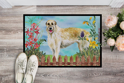 Decorate your space with Caroline's Treasures Irish Wolfhound artwork on a Doormat. Bring a bit of Spring into your home with a Spring Doormat. Welcome your guests in style with Caroline's Treasures Artwork Door Mat, designed to withstand almost any weather condition. This mat, measuring approximately 18 by 27 inches, is held together by durable black binding tape. Its top layer, composed of polyester felt, is dyed with the eye-catching image you see on the mat. A few layers below provide the mat with stability, while its rubber bottom is stamped to help prevent slipping and ensures safety. Caroline's Treasures mat works wonderfully as both an indoor or outdoor door mat. For cleaning, simply hose it off with water or use a power washer - no need for any cleaner that produces suds. Avoid scrubbing with a brush, instead, opt for the vacuum on floor setting. Designed manufactured and printed in the USA, this mat is a perfect addition to your porch, outdoor kitchen, entryway, or any indoor space. Its unique design makes it a charming decorative rug that greets your guests and adds a stylish touch to your home decor.