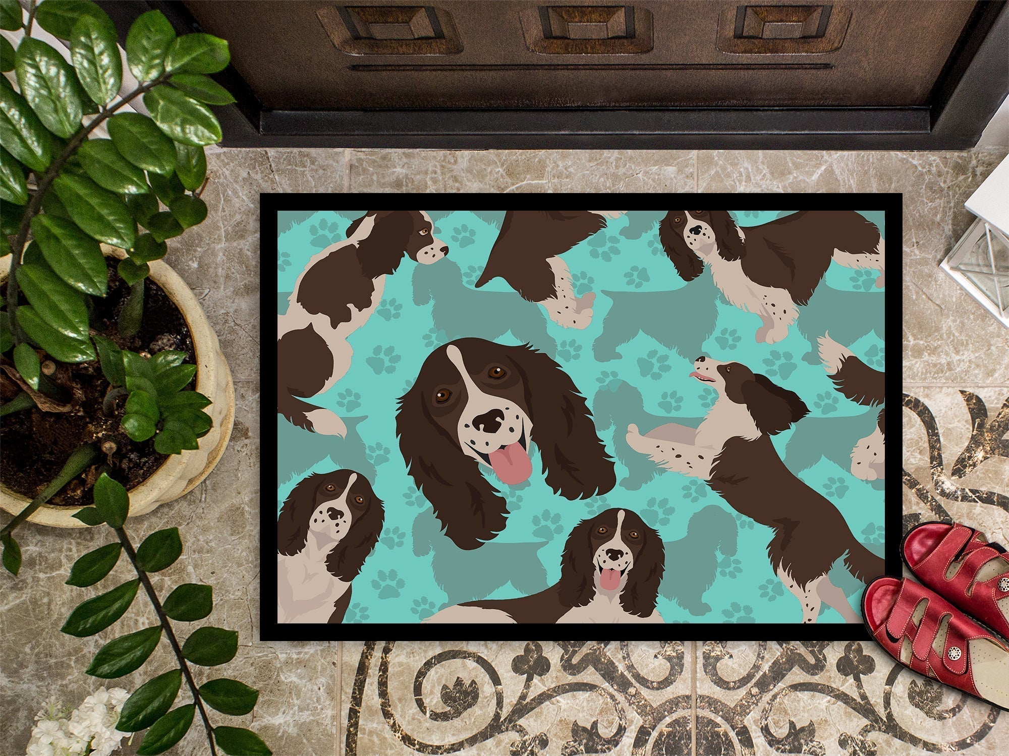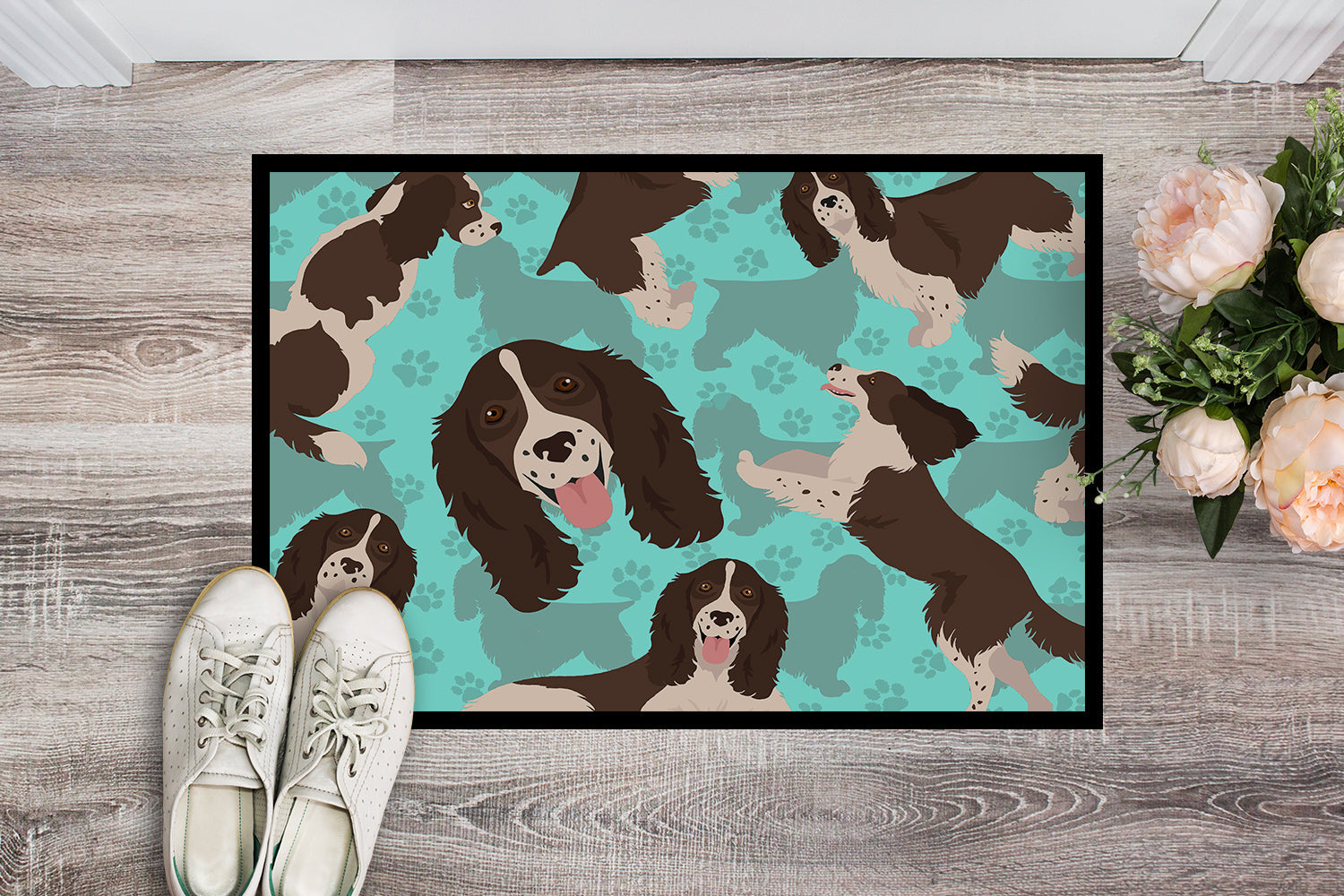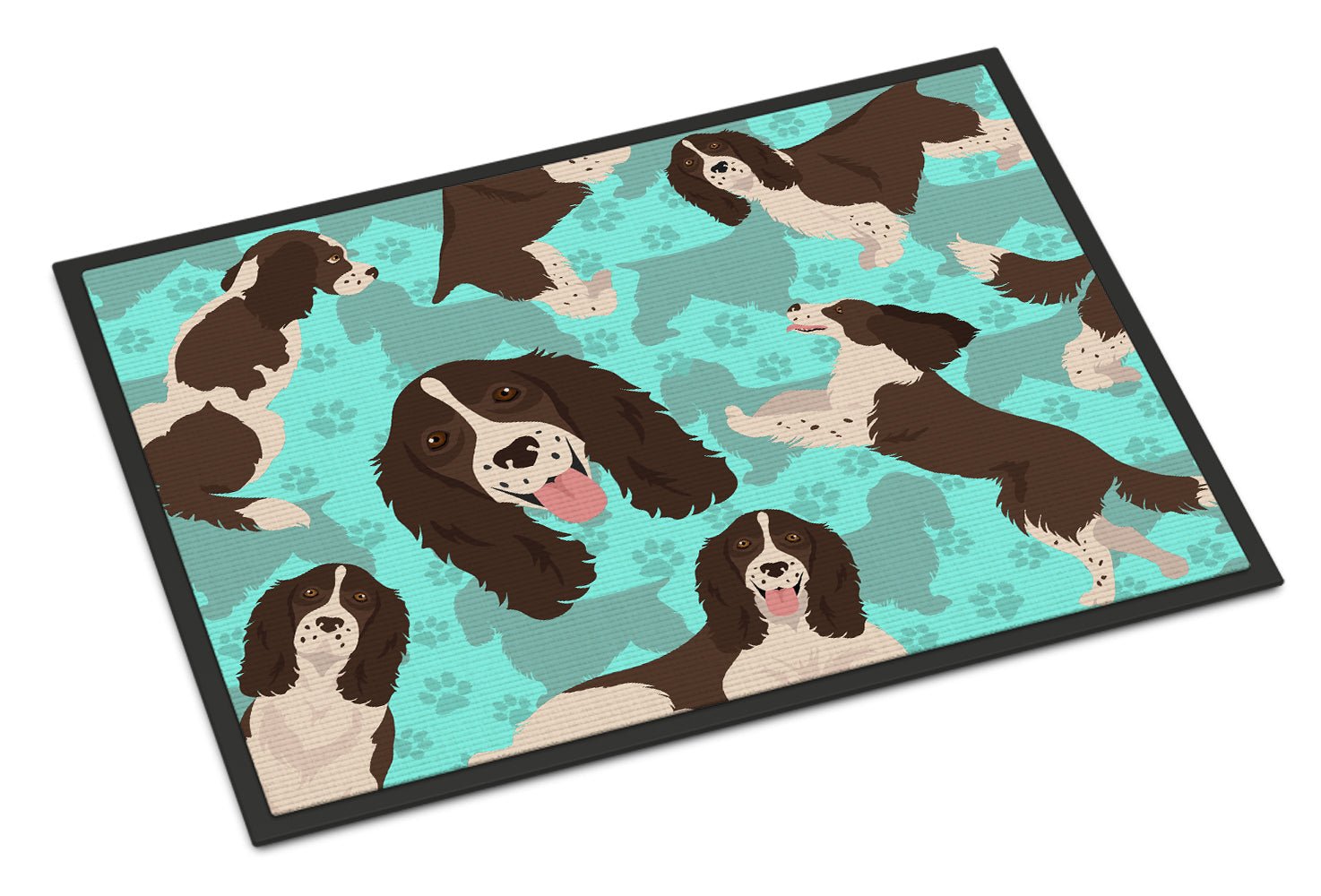 Decorate your space with Caroline's Treasures English Springer Spaniel artwork on a Doormat. Welcome your guests in style with Caroline's Treasures Artwork Door Mat, designed to withstand almost any weather condition. This mat, measuring approximately 24 by 36 inches, is held together by durable black binding tape. Its top layer, composed of polyester felt, is dyed with the eye-catching image you see on the mat. A few layers below provide the mat with stability, while its rubber bottom is stamped to help prevent slipping and ensures safety. Caroline's Treasures mat works wonderfully as both an indoor or outdoor door mat. For cleaning, simply hose it off with water or use a power washer - no need for any cleaner that produces suds. Avoid scrubbing with a brush, instead, opt for the vacuum on floor setting. Designed manufactured and printed in the USA, this mat is a perfect addition to your porch, outdoor kitchen, entryway, or any indoor space. Its unique design makes it a charming decorative rug that greets your guests and adds a stylish touch to your home decor.
