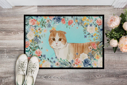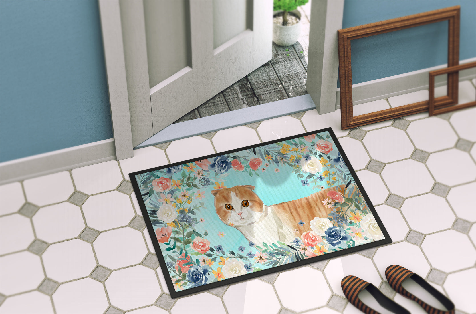 Decorate your space with Caroline's Treasures Scottish Fold artwork on a Doormat. Welcome your guests in style with Caroline's Treasures Artwork Door Mat, designed to withstand almost any weather condition. This mat, measuring approximately 18 by 27 inches, is held together by durable black binding tape. Its top layer, composed of polyester felt, is dyed with the eye-catching image you see on the mat. A few layers below provide the mat with stability, while its rubber bottom is stamped to help prevent slipping and ensures safety. Caroline's Treasures mat works wonderfully as both an indoor or outdoor door mat. For cleaning, simply hose it off with water or use a power washer - no need for any cleaner that produces suds. Avoid scrubbing with a brush, instead, opt for the vacuum on floor setting. Designed manufactured and printed in the USA, this mat is a perfect addition to your porch, outdoor kitchen, entryway, or any indoor space. Its unique design makes it a charming decorative rug that greets your guests and adds a stylish touch to your home decor.