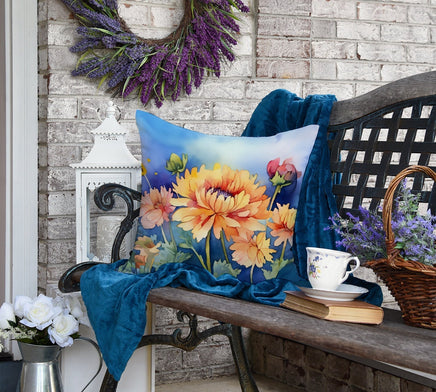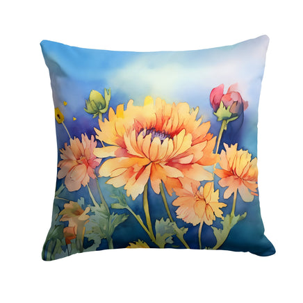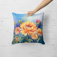 Throw Pillow featuring breed specific Chrysanthemums artwork. Revitalize your outdoor or indoor living space with Caroline's Treasures 18x18 Fabric Decorative Pillow. With a generously sized dimension of approximately 18 inches by 18 inches, this pillow makes a comfortable and aesthetic addition to any seating area. Made from a unique, water-resistant material developed by Caroline's Treasures, the pillow sham is 100% polyester fabric that's durable and ready to weather any condition. Its vibrant, full-color artwork will not fade over time as it is dyed with color-fast dyes. Whether you place it on your patio furniture, porch, veranda, or indoor couch, its soft canvas fabric ensures a cozy experience. The pillow is handcrafted in the United States, featuring a sham created from three pieces of fabric and a polyester insert for enduring shape and overstuffed comfort. Despite being robustly built to endure the outdoors, it is as soft and snug as your favorite indoor cushions. Please note, as all Caroline's Treasures pillows are handmade, sizes may vary slightly, adding to the charm of this unique decorative item.