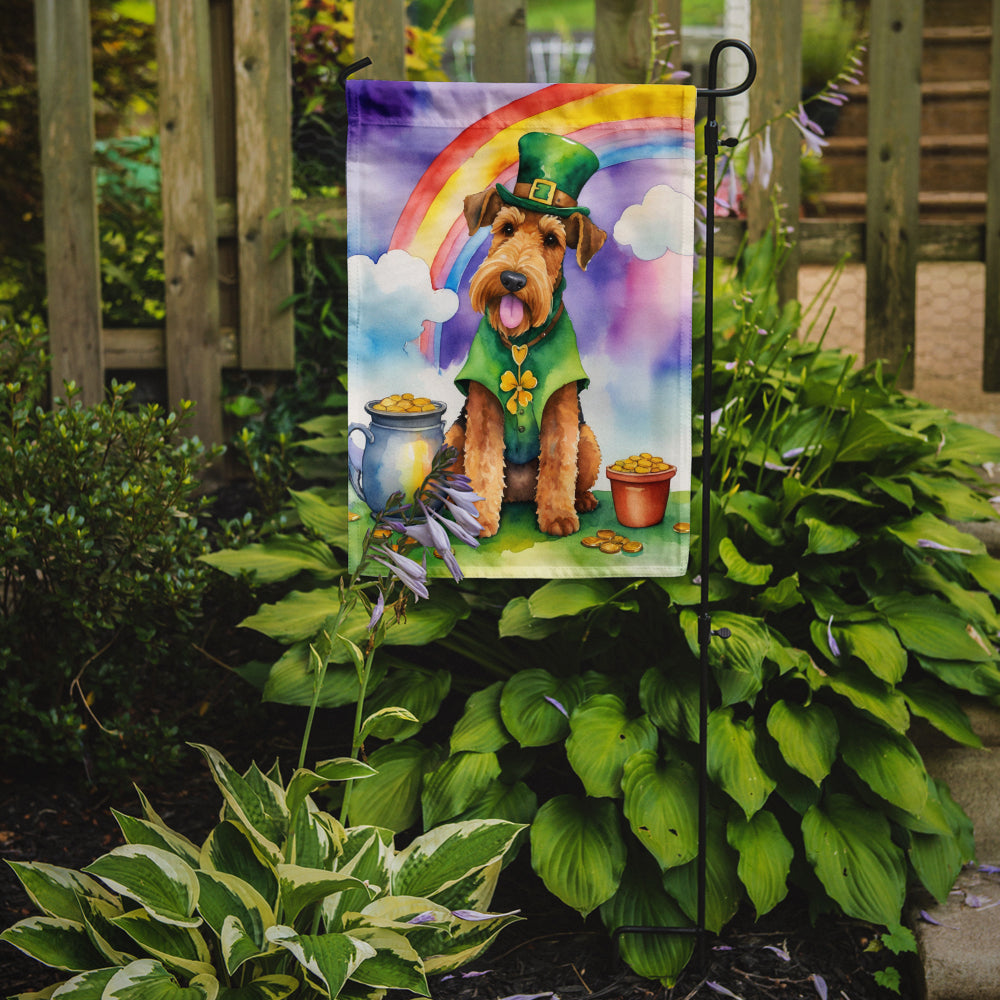 Decorate your space with our St Patrick's Day Airedale Terrier artwork on a Garden Flag. Enhance the beauty of your garden, patio, or yard with Caroline's Treasures Decorative Garden Flag, proudly made in the USA. Crafted from two pieces of thick, double-sided polyester fabric, this 2-ply garden flag is designed to withstand various weather conditions, making it water-resistant and weatherproof. Featuring correctly readable words on both sides, this garden flag offers a delightful visual experience from any angle. With its heavier weight, it stands out among other garden flags, ensuring stability and durability even in wind, rain, and snow. Measuring approximately 11 1/4 inches by 15 1/2 inches, this flag allows you to personalize your outdoor decor. It comes with a 1 1/2-inch sleeve sewn in, allowing easy attachment to any standard garden flag stand or garden size porch hanger (sold separately). Make a statement in your outdoor space with Caroline's Treasures Decorative Garden Flag, a vibrant and high-quality flag that adds color and personality to your surroundings. Proudly made in the USA, it's a symbol of quality craftsmanship and attention to detail.