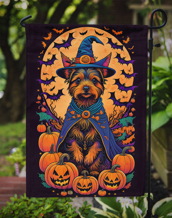 Decorate your space with our Halloween Australian Terrier artwork on a Garden Flag. Enhance the beauty of your garden, patio, or yard with Caroline's Treasures Decorative Garden Flag, proudly made in the USA. Crafted from two pieces of thick, double-sided polyester fabric, this 2-ply garden flag is designed to withstand various weather conditions, making it water-resistant and weatherproof. Featuring correctly readable words on both sides, this garden flag offers a delightful visual experience from any angle. With its heavier weight, it stands out among other garden flags, ensuring stability and durability even in wind, rain, and snow. Measuring approximately 11 1/4 inches by 15 1/2 inches, this flag allows you to personalize your outdoor decor. It comes with a 1 1/2-inch sleeve sewn in, allowing easy attachment to any standard garden flag stand or garden size porch hanger (sold separately). Make a statement in your outdoor space with Caroline's Treasures Decorative Garden Flag, a vibrant and high-quality flag that adds color and personality to your surroundings. Proudly made in the USA, it's a symbol of quality craftsmanship and attention to detail.