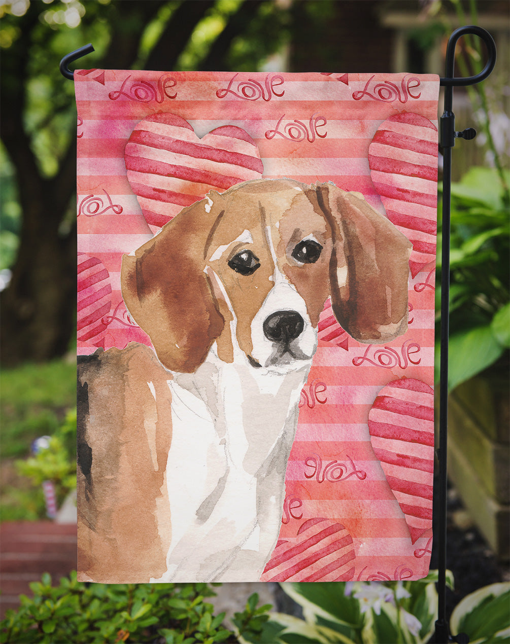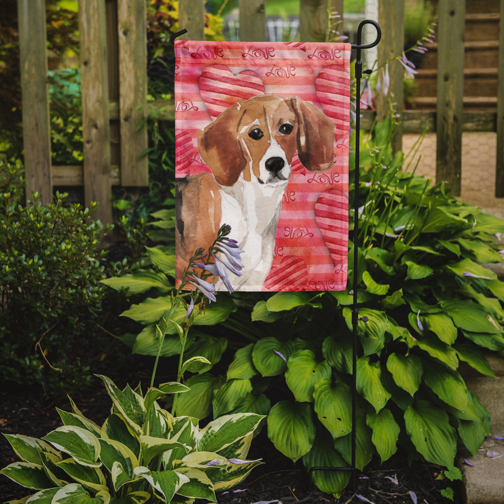 Decorate your space with our Valentine's Day Beagle artwork on a Garden Flag. Enhance the beauty of your garden, patio, or yard with Caroline's Treasures Decorative Garden Flag, proudly made in the USA. Crafted from two pieces of thick, double-sided polyester fabric, this 2-ply garden flag is designed to withstand various weather conditions, making it water-resistant and weatherproof. Featuring correctly readable words on both sides, this garden flag offers a delightful visual experience from any angle. With its heavier weight, it stands out among other garden flags, ensuring stability and durability even in wind, rain, and snow. Measuring approximately 11 1/4 inches by 15 1/2 inches, this flag allows you to personalize your outdoor decor. It comes with a 1 1/2-inch sleeve sewn in, allowing easy attachment to any standard garden flag stand or garden size porch hanger (sold separately). Make a statement in your outdoor space with Caroline's Treasures Decorative Garden Flag, a vibrant and high-quality flag that adds color and personality to your surroundings. Proudly made in the USA, it's a symbol of quality craftsmanship and attention to detail.