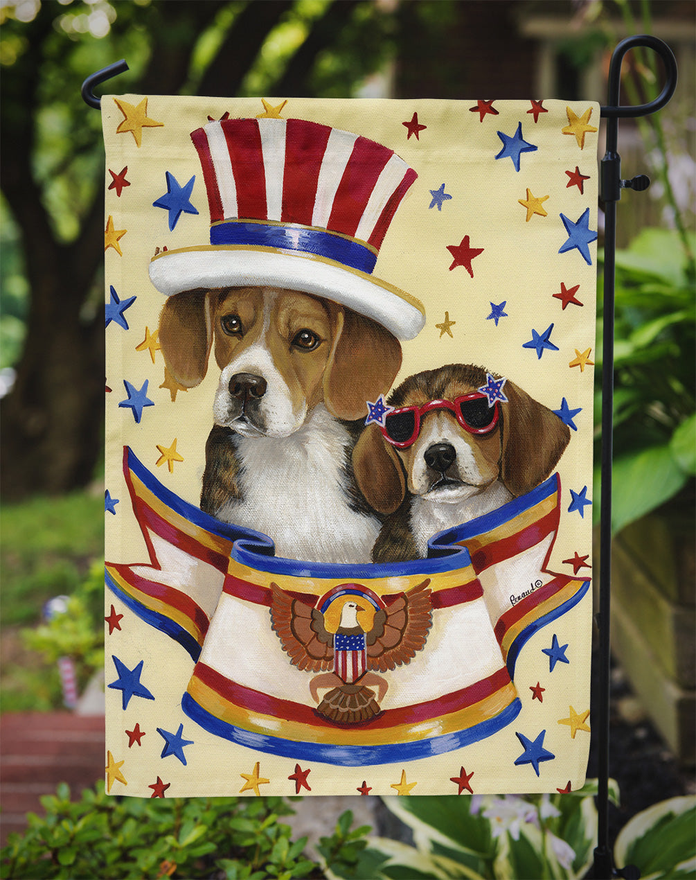 Decorate your space with our Beagle artwork on a Garden Flag. Enhance the beauty of your garden, patio, or yard with Caroline's Treasures Decorative Garden Flag, proudly made in the USA. Crafted from two pieces of thick, double-sided polyester fabric, this 2-ply garden flag is designed to withstand various weather conditions, making it water-resistant and weatherproof. Featuring correctly readable words on both sides, this garden flag offers a delightful visual experience from any angle. With its heavier weight, it stands out among other garden flags, ensuring stability and durability even in wind, rain, and snow. Measuring approximately 11 1/4 inches by 15 1/2 inches, this flag allows you to personalize your outdoor decor. It comes with a 1 1/2-inch sleeve sewn in, allowing easy attachment to any standard garden flag stand or garden size porch hanger (sold separately). Make a statement in your outdoor space with Caroline's Treasures Decorative Garden Flag, a vibrant and high-quality flag that adds color and personality to your surroundings. Proudly made in the USA, it's a symbol of quality craftsmanship and attention to detail.