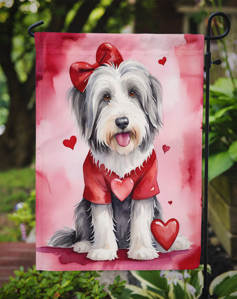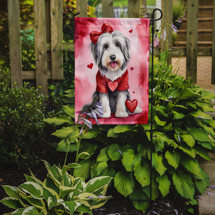 Decorate your space with our Valentine's Day Bearded Collie artwork on a Garden Flag. Enhance the beauty of your garden, patio, or yard with Caroline's Treasures Decorative Garden Flag, proudly made in the USA. Crafted from two pieces of thick, double-sided polyester fabric, this 2-ply garden flag is designed to withstand various weather conditions, making it water-resistant and weatherproof. Featuring correctly readable words on both sides, this garden flag offers a delightful visual experience from any angle. With its heavier weight, it stands out among other garden flags, ensuring stability and durability even in wind, rain, and snow. Measuring approximately 11 1/4 inches by 15 1/2 inches, this flag allows you to personalize your outdoor decor. It comes with a 1 1/2-inch sleeve sewn in, allowing easy attachment to any standard garden flag stand or garden size porch hanger (sold separately). Make a statement in your outdoor space with Caroline's Treasures Decorative Garden Flag, a vibrant and high-quality flag that adds color and personality to your surroundings. Proudly made in the USA, it's a symbol of quality craftsmanship and attention to detail.